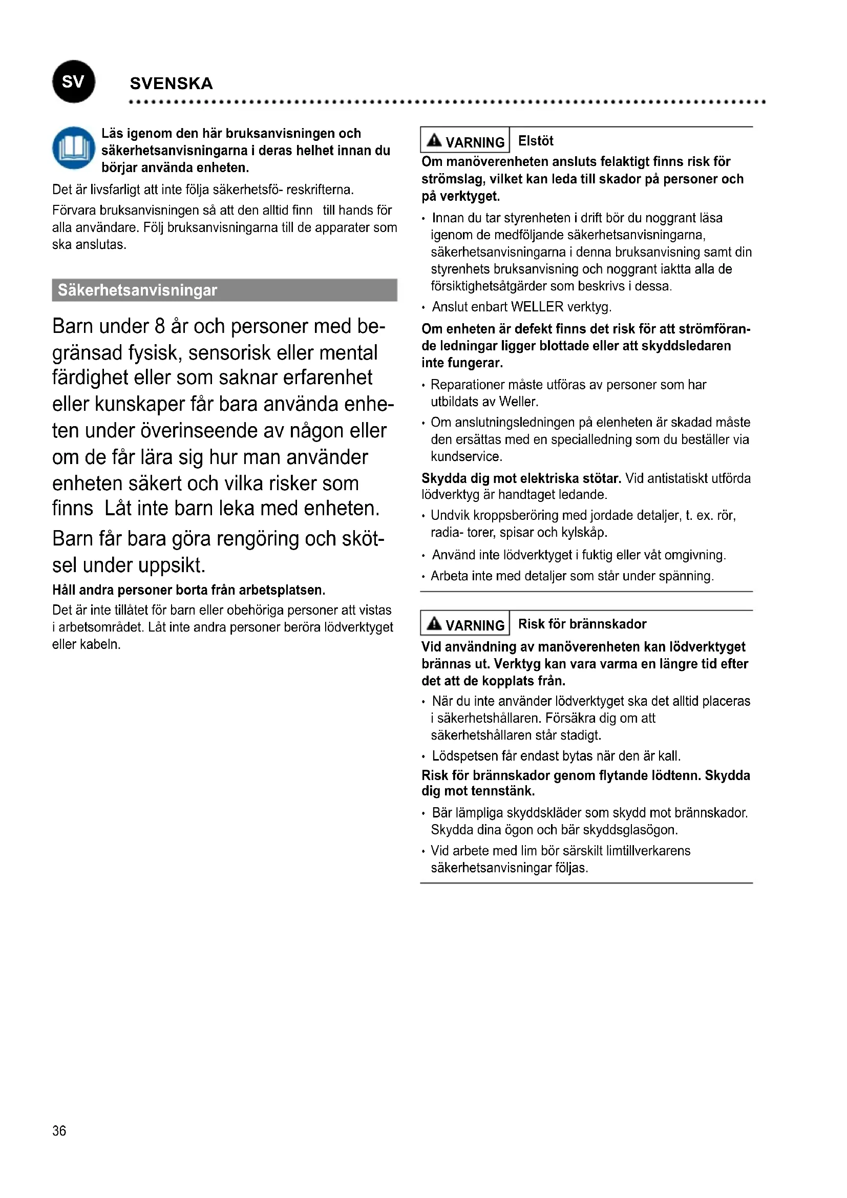 - Bringa inga brännbara förmål, vätskor eller gaser i närhetenavdetvarmalödverktyget. Förvara lödverktyget på säkert ställe.Enheterochverktyg som inte används bör förvaras på ett torrt och högt beläget ellerlåstställe,utomräckhållförbarn.Lödverktygsominte användsskaförvarasmedspänningochtryckfrånkopplade. Nätkabeln får endast sättas i därtill tillåtna nätuttag eller adaptrar. Kontrollera om nätspänningen överensstämmer meduppgifternapåtypskylten.Maskinenskallvara frånslagen när kontakten anslutes till vägguttaget. Använd inte kabeln för annat än den är avsedd för.Bär aldrig enheten genom att hålla den i kabeln. Använd inte kabelnförattdrautkontaktenuruttaget.Skyddakabelnmot värme, olja och skarpa kanter. Var uppmärksam. Var uppmärksam på vad du gör. Gå förnuftigttillväganärduarbetar.Användinteverktygetnärdu är okoncentrerad. Undvik onormal arbetsställning. Utforma arbetsplatsen ergonomiskt riktigt. Tänk på att stå och arbeta på ett ergono- miskt sätt så skonar du kroppen. Lödverktyget får endast tas i drift när den är i fullgott tekniskt skick.Skyddsanordningarfårintetasurdrift. Fel och defekter måste omedelbart åtgärdas. Innan du börjaranvändaenheten/verktygetmåstedualltidnoggrant kontrolleraattskyddsanordningarnaärigottskickoch fungerar som de ska. Kontrollera att rörliga delar fungerar som de ska och att de inte har fastnat, samt att inga delar är skadade.Samtligadelarskamonteraskorrektochuppfylla alla krav. Endast på så vis kan enhetens felfria funktion garanteras. Använd rätt verktyg. Använd endast tillbehör och tillsat- senhetersomfinn itillbehörslistanellersomgodkäntsav tillverkaren. Använd endast tillbehör och tillsatsenheter från WELLER på originalenheter från WELLER. Om du använder andraverktygellerandratillbehörkandetinnebärariskför personskada. Säkra verktyget. Använd fastspänningsanordningar till att hållafastarbetsstycket. Använd lödröksutsug.Omdetfinn anordningarför anslutning av lödröksutsug tillgängliga, kontrollera att dessa är anslutna och att de används på rätt sätt. Använd Maskinen Enligt Anvisningarna FörsörjningsenhetWELLERlödverktyg.Användendast lödstationen enligt de metoder och villkor för lödning och som anges i bruksanvisningen. Denna enhet får endast användas inomhus i rumstempera- tur.Skyddadetfrånfuktochdirektsolljus. Användarkategorier Vissaarbetsmomentinnebärenstörreolycksriskochfår därför endast utföras av utbildad fackpersonal. Arbetsmoment Användarkategorier Inställning av lödpara- metrar Fackpersonal med teknisk utbildning Byteavelektriskareser- vdelar Elektriker Inställning av underhålls- intervall Säkerhetsexpert Operatör Lekman Operatör Byteavelektriskareser- vdelar Tekniklärlingar under överinseende av utbildad fackman skötsel och underhåll VARNING Tag ut kontakten ur vägguttaget, om maskinen skall åtgärdas. Låt apparaten svalna. Kontrollera regelbundet alla anslutna kablar och slangar. Skadadeelverktygmåsteomedelbarttasurbruk. Reparationer måste utföras av personer som har utbildats av Weller. Använd endast originalreservdelar. Garanti Köparen kan reklamera produkten upp till ett år efter det att den har levererats. Detta gäller inte köparens ångerrätt enligt §§ 478, 479 BGB. Vi tar enbart ansvar för den av oss utfärdade garantin om kvalitets- och hållbarhetsgaranti skriftligen har angivits av ossunderbegreppet”garanti”. Omverktygetharanväntsfelaktigtelleromokvalificerad personer har gjort ingrepp i det, upphör garantin att gälla. Mer information hittar du på www.weller-tools.com.