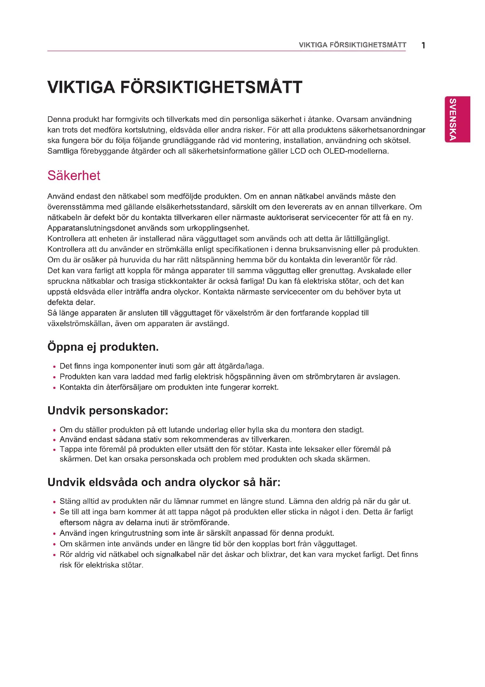 Denna produkt har formgivits och tillverkats med din personliga säkerhet i åtanke. Ovarsam användning kan trots det medföra kortslutning, eldsvåda eller andra risker. För att alla produktens säkerhetsanordningar ska fungera bör du följa följande grundläggande råd vid montering, installation, användning och skötsel.Samtliga förebyggande åtgärder och all säkerhetsinformatione gäller LCD och OLED-modellerna. Säkerhet Använd endast den nätkabel som medföljde produkten. Om en annan nätkabel används måste den överensstämma med gällande elsäkerhetsstandard, särskilt om den levererats av en annan tillverkare. Om nätkabeln är defekt bör du kontakta tillverkaren eller närmaste auktoriserat servicecenter för att få en ny.Apparatanslutningsdonet används som urkopplingsenhet.Kontrollera att enheten är installerad nära vägguttaget som används och att detta är lättillgängligt.Kontrollera att du använder en strömkälla enligt specifikationen i denna bruksanvisning eller på produkten. Om du är osäker på huruvida du har rätt nätspänning hemma bör du kontakta din leverantör för råd.Det kan vara farligt att koppla för många apparater till samma vägguttag eller grenuttag. Avskalade eller spruckna nätkablar och trasiga stickkontakter är också farliga! Du kan få elektriska stötar, och det kan uppstå eldsvåda eller inträffa andra olyckor. Kontakta närmaste servicecenter om du behöver byta ut defekta delar.Så länge apparaten är ansluten till vägguttaget för växelström är den fortfarande kopplad till växelströmskällan, även om apparaten är avstängd. Öppna ej produkten.