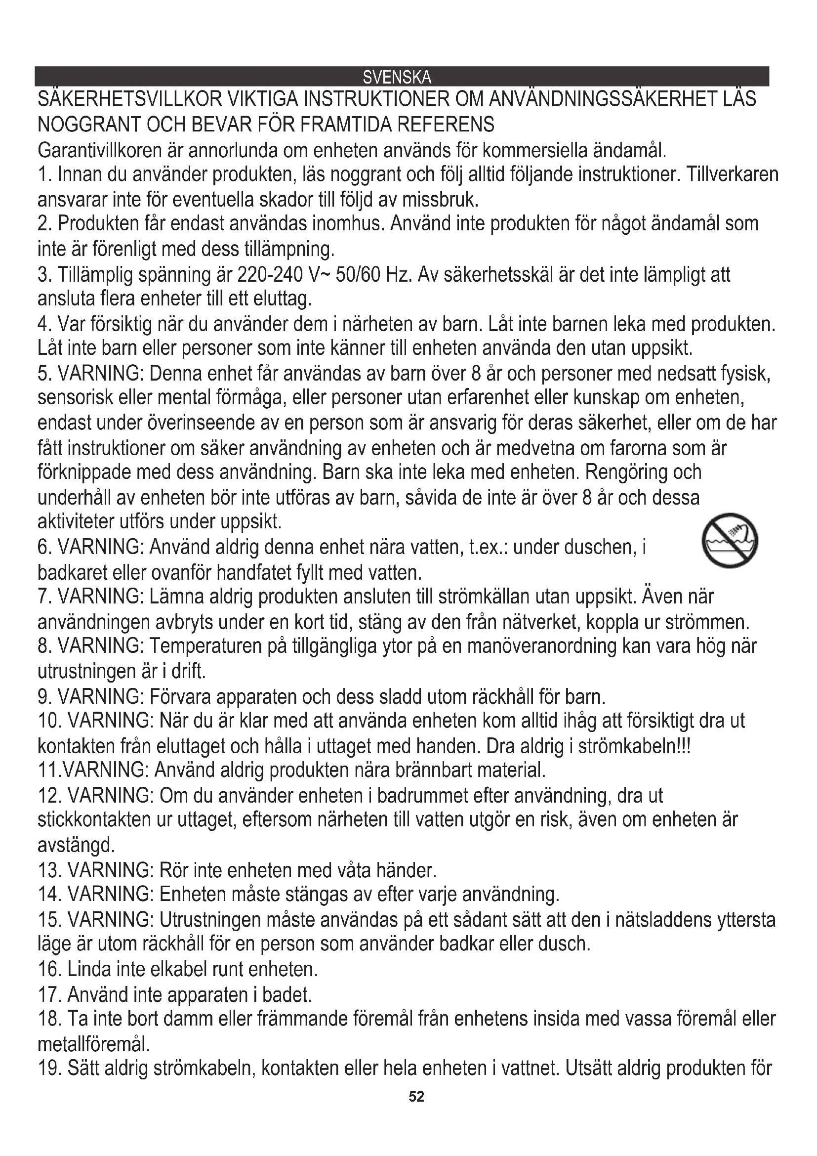Garantivillkoren är annorlunda om enheten används för kommersiella ändamål. 11.VARNING: Använd aldrig produkten nära brännbart material.