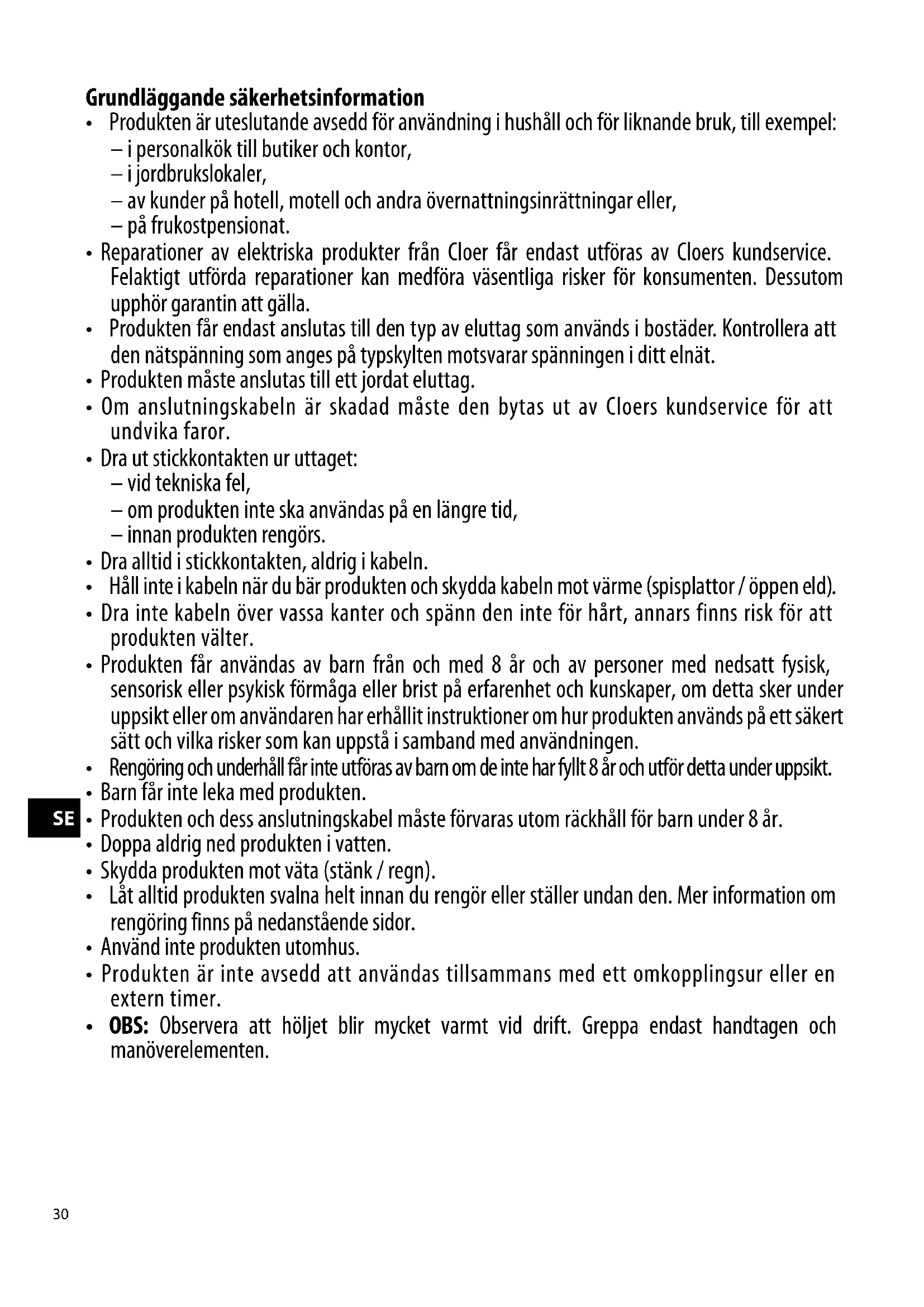 - Reparationer av elektriska produkter från Cloer får endast utföras av Cloers kundservice. Felaktigt utförda reparationer kan medföra väsentliga risker för konsumenten. Dessutom upphör garantin att gälla.