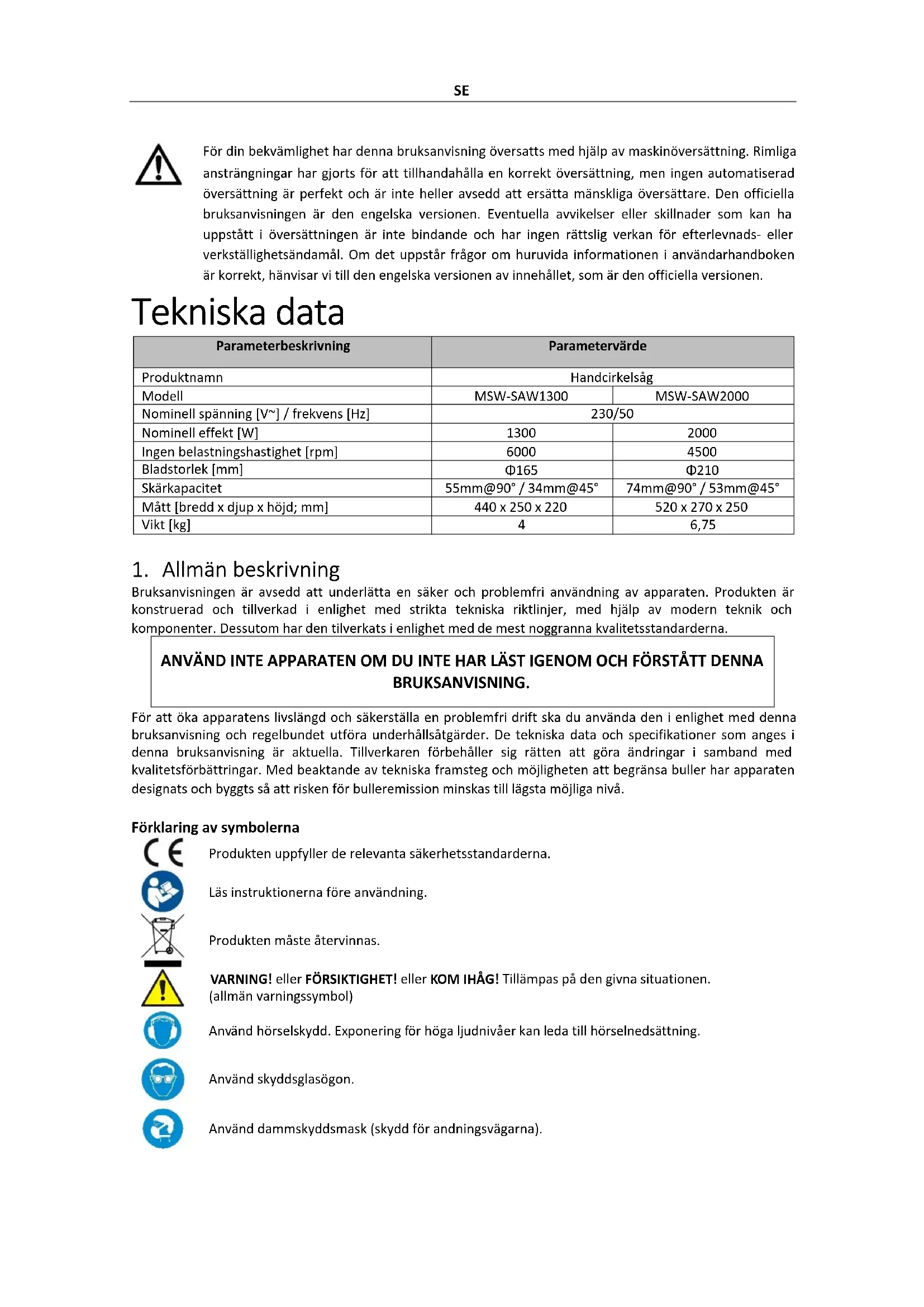 j) Ikke bruk skarpe gjenstander og/eller metallgjenstander til rengjøring (f.eks. stålbørste eller metallspatel), da disse kan skade apparatets overflatemateriale. k) Enheten må ikke rengjøres med syreholdige stoffer, medisinske midler, fortynningsmidler, drivstoff, oljer eller andre kjemiske stoffer, da dette kan skade enheten. KASSERING AV BRUKTE ENHETER: Apparatet må ikke kastes i det kommunale avfallssystemet. Lever den til et gjenvinnings- og innsamlingssted for elektriske apparater. Kontroller symbolet på produktet, bruksanvisningen og emballasjen. Plasten som brukes til å konstruere enheten, kan resirkuleres i henhold til merkingen. Når du velger å resirkulere, gir du et viktig bidrag til å beskytte miljøet. Kontakt lokale myndigheter for informasjon om ditt lokale gjenvinningsanlegg.SE För din bekvämlighet har denna bruksanvisning översatts med hjälp av maskinöversättning. Rimliga ansträngningar har gjorts för att tillhandahålla en korrekt översättning, men ingen automatiserad översättning är perfekt och är inte heller avsedd att ersätta mänskliga översättare. Den officiella bruksanvisningen är den engelska versionen. Eventuella avvikelser eller skillnader som kan ha uppstått i översättningen är inte bindande och har ingen rättslig verkan för efterlevnads- eller verkställighetsändamål. Om det uppstår frågor om huruvida informationen i användarhandboken är korrekt, hänvisar vi till den engelska versionen av innehållet, som är den officiella versionen. Tekniska data Parameterbeskrivning Parametervärde Produktnamn Handcirkelsåg Modell MSW-SAW1300 MSW-SAW2000 Nominell spänning [V~] / frekvens [Hz] 230/50 Nominell effekt [W]