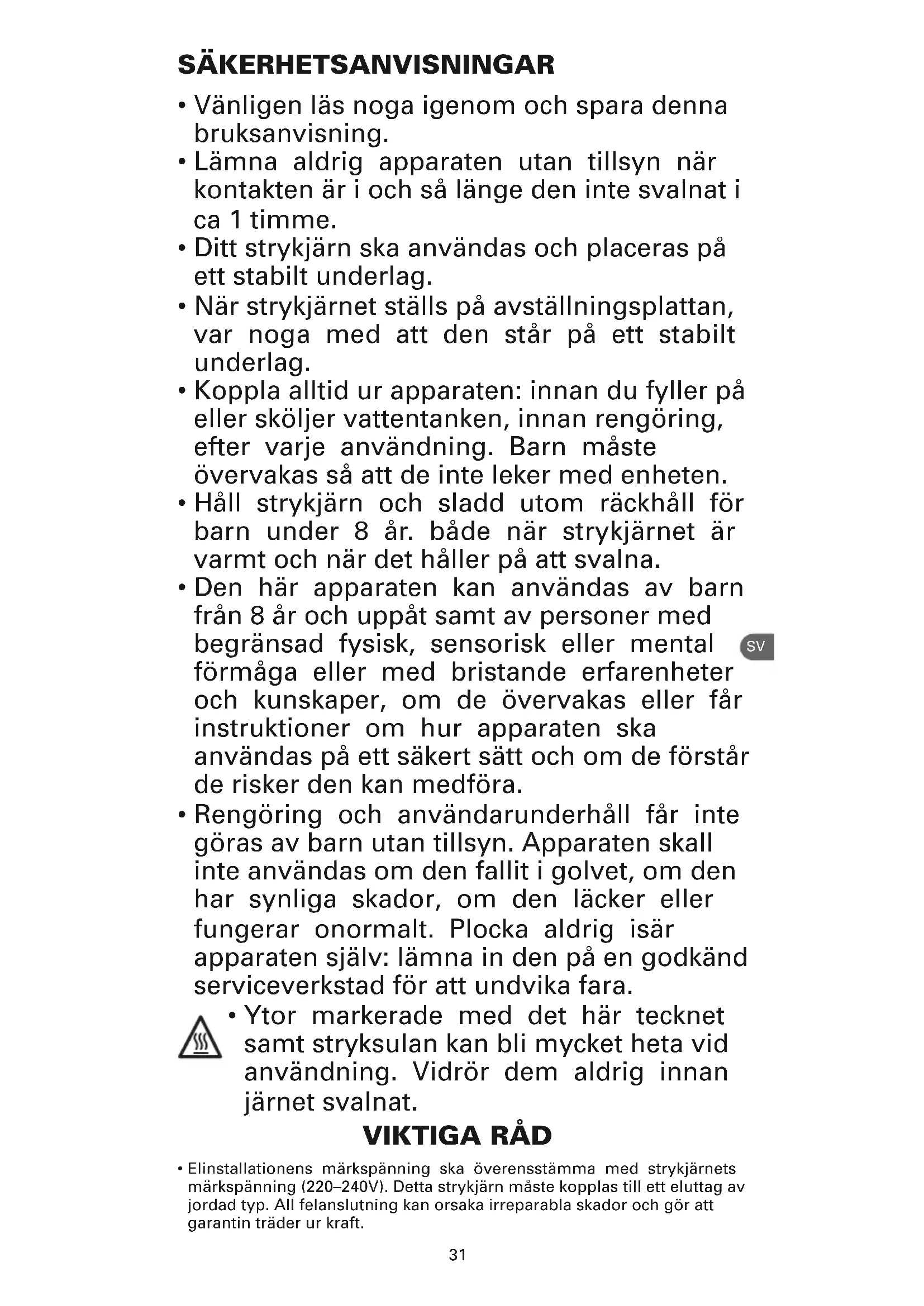 - Håll strykjärn och sladd utom räckhåll för barn under 8 år. både när strykjärnet är varmt och när det håller på att svalna.