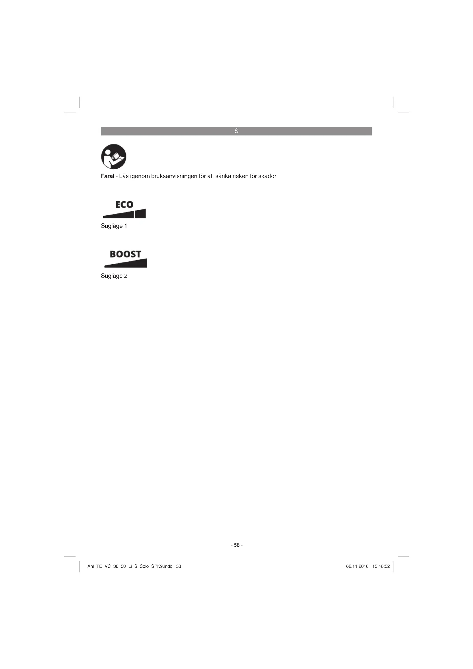 Fara! - Läs igenom bruksanvisningen för att sänka risken för skador Sugläge 1 Sugläge 2 Anl_TE_VC_36_30_Li_S_Solo_SPK9.indb 58Anl_TE_VC_36_30_Li_S_Solo_SPK9.indb 58 06.11.2018 15:48:5206.11.2018 15:48:52S