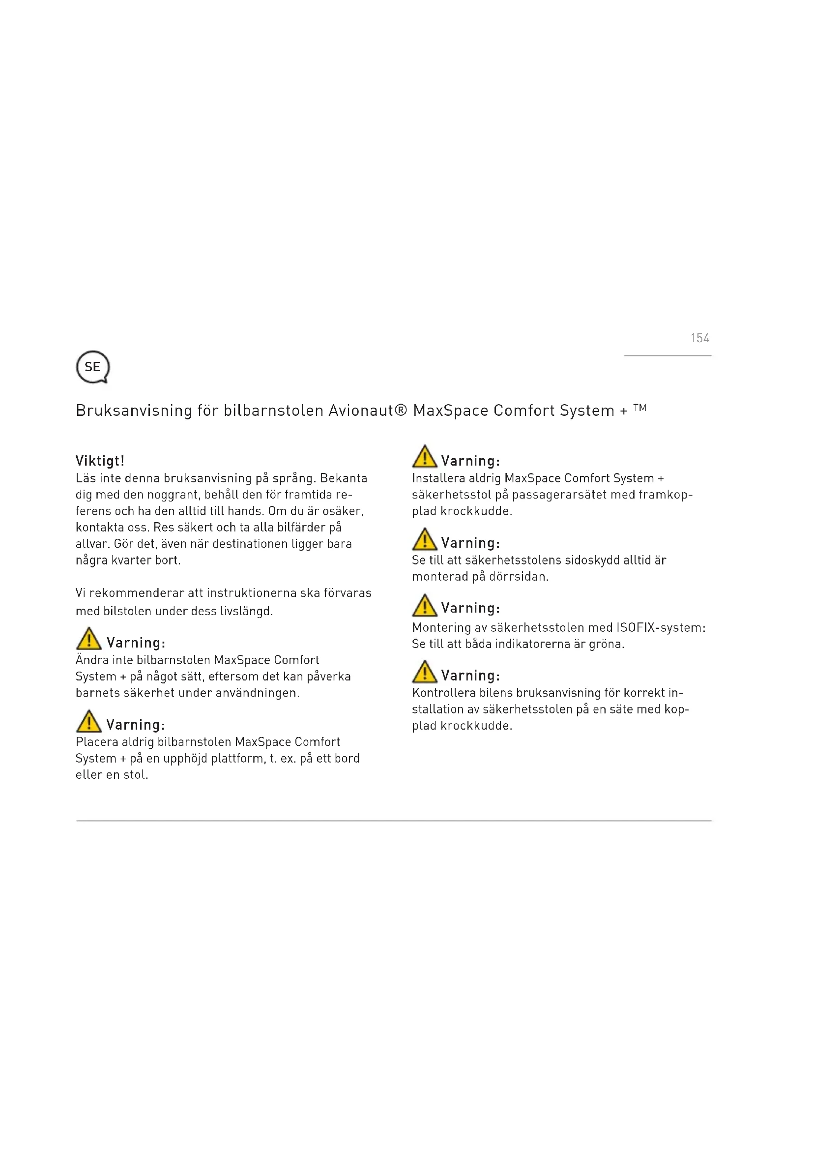 Адрес компании: Ł.KARWALA Szarlejka, ul. Lukaszewicza 172 42-130 Wreczyca Wielka, Polska (1) Приобретенные изделия с удаленными или измененными этикетками или идентификационными номерами считаются неавторизованными. В связи с тем, что подлинность таких изделий не может быть определена, гарантия на них не распространяется. 153Viktigt! Läs inte denna bruksanvisning på språng. Bekanta dig med den noggrant, behåll den för framtida re- ferens och ha den alltid till hands. Om du är osäker, kontakta oss. Res säkert och ta alla bilfärder på allvar. Gör det, även när destinationen ligger bara några kvarter bort. Vi rekommenderar att instruktionerna ska förvaras med bilstolen under dess livslängd. Varning: Ändra inte bilbarnstolen MaxSpace Comfort System + på något sätt, eftersom det kan påverka barnets säkerhet under användningen. Varning: Placera aldrig bilbarnstolen MaxSpace Comfort System + på en upphöjd plattform, t. ex. på ett bord eller en stol. Bruksanvisning för bilbarnstolen Avionaut® MaxSpace Comfort System + ™ Varning: Installera aldrig MaxSpace Comfort System + säkerhetsstol på passagerarsätet med framkop- plad krockkudde. Varning: Se till att säkerhetsstolens sidoskydd alltid är monterad på dörrsidan. Varning: Montering av säkerhetsstolen med ISOFIX-system: Se till att båda indikatorerna är gröna. Varning: Kontrollera bilens bruksanvisning för korrekt in- stallation av säkerhetsstolen på en säte med kop- plad krockkudde.