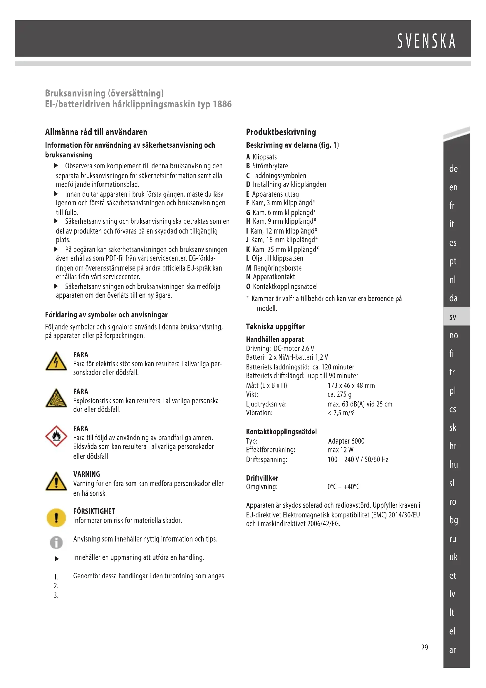 Bruksanvisning (översättning) El-/batteridriven hårklippningsmaskin typ 1886 Allmänna råd till användaren Information för användning av säkerhetsanvisning och bruksanvisning f Observera som komplement till denna bruksanvisning den separata bruksanvisningen för säkerhetsinformation samt alla medföljande informationsblad. f Innan du tar apparaten i bruk första gången, måste du läsa igenom och förstå säkerhetsanvisningen och bruksanvisningen till fullo. f Säkerhetsanvisning och bruksanvisning ska betraktas som en del av produkten och förvaras på en skyddad och tillgänglig plats. f På begäran kan säkerhetsanvisningen och bruksanvisningen även erhållas som PDF-fil från vårt servicecenter. EG-förkla- ringen om överensstämmelse på andra officiella EU-språk kan erhållas från vårt servicecenter. f Säkerhetsanvisningen och bruksanvisningen ska medfölja apparaten om den överlåts till en ny ägare. Förklaring av symboler och anvisningar Följande symboler och signalord används i denna bruksanvisning, på apparaten eller på förpackningen. FARA Fara för elektrisk stöt som kan resultera i allvarliga per- sonskador eller dödsfall. FARA Explosionsrisk som kan resultera i allvarliga personska- dor eller dödsfall. FARA Fara till följd av användning av brandfarliga ämnen. Eldsvåda som kan resultera i allvarliga personskador eller dödsfall. VARNING Varning för en fara som kan medföra personskador eller en hälsorisk. FÖRSIKTIGHET Informerar om risk för materiella skador. Anvisning som innehåller nyttig information och tips. Innehåller en uppmaning att utföra en handling. Genomför dessa handlingar i den turordning som anges.