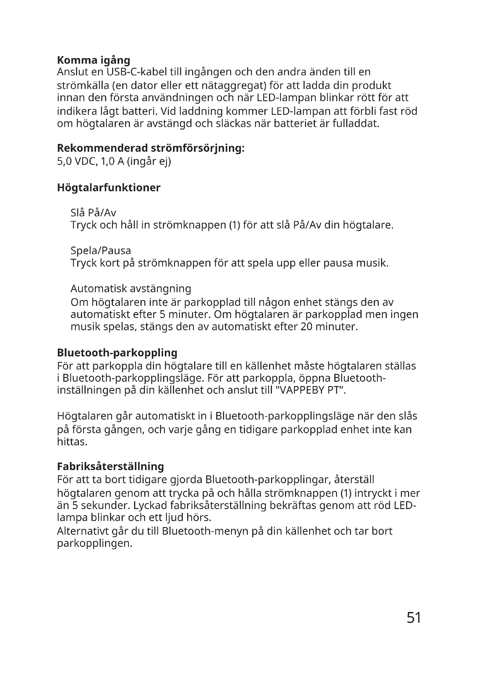 LED-status Blinkande vitt:Bluetoothparkopplas. Fast vitt:Parkoppladtillenenhet. Blinkande rött:Svagtbatteri. Fast rött:Laddas(närhögtalarenäravstängd). Svenska51 Komma igång AnslutenUSB-C-kabeltillingångenochdenandraändentillen strömkälla(endatorellerettnätaggregat)förattladdadinprodukt innandenförstaanvändningenochnärLED-lampanblinkarröttföratt indikeralågtbatteri.VidladdningkommerLED-lampanattförblifaströd omhögtalarenäravstängdochsläckasnärbatterietärfulladdat. Rekommenderad strömförsörjning: 5,0VDC,1,0A(ingårej) Högtalarfunktioner SlåPå/Av Tryckochhållinströmknappen(1)förattslåPå/Avdinhögtalare. Spela/Pausa Tryckkortpåströmknappenförattspelauppellerpausamusik. Automatiskavstängning Omhögtalareninteärparkoppladtillnågonenhetstängsdenav automatisktefter5minuter.Omhögtalarenärparkoppladmeningen musikspelas,stängsdenavautomatisktefter20minuter. Bluetooth-parkoppling Förattparkoppladinhögtalaretillenkällenhetmåstehögtalarenställas iBluetooth-parkopplingsläge.Förattparkoppla,öppnaBluetooth- inställningenpådinkällenhetochansluttill"VAPPEBYPT”. HögtalarengårautomatisktiniBluetooth-parkopplingslägenärdenslås påförstagången,ochvarjegångentidigareparkoppladenhetintekan hittas. Fabriksåterställning FöratttaborttidigaregjordaBluetooth-parkopplingar,återställ högtalarengenomatttryckapåochhållaströmknappen(1)intrycktimer än5sekunder.LyckadfabriksåterställningbekräftasgenomattrödLED- lampablinkarochettljudhörs. AlternativtgårdutillBluetooth-menynpådinkällenhetochtarbort parkopplingen.52 Stereoparkoppling: TvåbärbaraVAPPEBYkankopplasihoptillenstereo: 1.SetillattbådahögtalarnaäriBluetooth-sökläge. 2.Trycktvågångerpåströmknappenpåenavhögtalarna.Ettljud bekräftarlyckadstereoparkoppling. 3.AnsluttillkällenhetengenomattföljainstruktionenBluetooth- parkoppling. Bra att veta