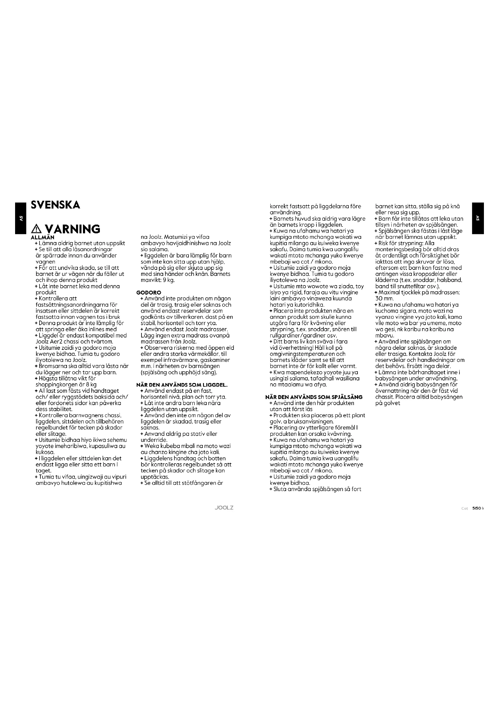 SVENSKA VARNING ALLMÄN + Lämna aldrig barnet utan uppsikt + Se till att alla låsanordningar är spärrade innan du använder vagnen + För att undvika skada, se till att barnet är ur vägen när du fäller ut och ihop denna produkt + Låt inte barnet leka med denna produkt + Kontrollera att fastsättningsanordningarna för insatsen eller sittdelen är korrekt fastsatta innan vagnen tas i bruk + Denna produkt är inte lämplig för att springa eller åka inlines med + Liggdel är endast kompatibel med Joolz Aer2 chassi och tvärtom. + Usitumie zaidi ya godoro moja kwenye bidhaa. Tumia tu godoro iliyotolewa na Joolz. + Bromsarna ska alltid vara låsta när du lägger ner och tar upp barn. + Högsta tillåtna vikt för shoppingkorgen är 8 kg + All last som fästs vid handtaget och/ eller ryggstödets baksida och/ eller fordonets sidor kan påverka dess stabilitet. + Kontrollera barnvagnens chassi, liggdelen, sittdelen och tillbehören regelbundet för tecken på skador eller slitage. + Usitumie bidhaa hiyo ikiwa sehemu yoyote imeharibiwa, kupasuliwa au kukosa. + I liggdelen eller sittdelen kan det endast ligga eller sitta ett barn I taget. + Tumia tu vifaa, uingizwaji au vipuri ambavyo hutolewa au kupitishwa na Joolz. Matumizi ya vifaa ambavyo havijaidhinishwa na Joolz sio salama. + liggdelen är bara lämplig för barn som inte kan sitta upp utan hjälp, vända på sig eller skjuta upp sig med sina händer och knän. Barnets maxvikt: 9 kg. GODORO + Använd inte produkten om någon del är trasig, trasig eller saknas och använd endast reservdelar som godkänts av tillverkaren. dast på en stabil, horisontell och torr yta. + Använd endast Joolz madrasser. Lägg ingen extra madrass ovanpå madrassen från Joolz. + Observera riskerna med öppen eld eller andra starka värmekällor, till exempel infravärmare, gaskaminer m.m. i närheten av barnsängen (spjälsäng och upphöjd säng). NÄR DEN ANVÄNDS SOM LIGGDEL. + Använd endast på en fast, horisontell nivå, plan och torr yta. + Låt inte andra barn leka nära liggdelen utan uppsikt. + Använd den inte om någon del av liggdelen är skadad, trasig eller saknas. + Anvand aldrig pa stativ eller underride. + Weka kubeba mbali na moto wazi au chanzo kingine cha joto kali. + Liggdelens handtag och botten bör kontrolleras regelbundet så att tecken på skador och slitage kan upptäckas. + Se alltid till att stötfångaren är korrekt fastsatt på liggdelarna före användning. + Barnets huvud ska aldrig vara lägre än barnets kropp i liggdelen. + Kuwa na ufahamu wa hatari ya kumpiga mtoto mchanga wakati wa kupitia milango au kuiweka kwenye sakafu. Daima tumia kwa uangalifu wakati mtoto mchanga yuko kwenye mbebaji wa cot / mkono. + Usitumie zaidi ya godoro moja kwenye bidhaa. Tumia tu godoro iliyotolewa na Joolz. + Usitumie mto wowote wa ziada, toy isiyo ya rigid, faraja au vitu vingine laini ambavyo vinaweza kuunda hatari ya kutoridhika. + Placera inte produkten nära en annan produkt som skulle kunna utgöra fara för kvävning eller strypning, t.ex. snoddar, snören till rullgardiner/gardiner osv. + Ditt barns liv kan sväva i fara vid överhettning! Håll koll på omgivningstemperaturen och barnets kläder samt se till att barnet inte är för kallt eller varmt. + Kwa mapendekezo yoyote juu ya usingizi salama, tafadhali wasiliana na mtaalamu wa afya. NÄR DEN ANVÄNDS SOM SPJÄLSÄNG + Använd inte den här produkten utan att först läs + Produkten ska placeras på ett plant golv. a bruksanvisningen. + Placering av ytterligare föremål I produkten kan orsaka kvävning. + Kuwa na ufahamu wa hatari ya kumpiga mtoto mchanga wakati wa kupitia milango au kuiweka kwenye sakafu. Daima tumia kwa uangalifu wakati mtoto mchanga yuko kwenye mbebaji wa cot / mkono. + Usitumie zaidi ya godoro moja kwenye bidhaa. + Sluta använda spjälsängen så fort barnet kan sitta, ställa sig på knä eller resa sig upp. + Barn får inte tillåtas att leka utan tillsyn i närheten av spjälsängen. + Spjälsängen ska fästas i låst läge när barnet lämnas utan uppsikt. + Risk för strypning: Alla monteringsbeslag bör alltid dras åt ordentligt och försiktighet bör iakttas att inga skruvar är lösa, eftersom ett barn kan fastna med antingen vissa kroppsdelar eller kläderna (t.ex. snoddar, halsband, band till snutteltar osv.). + Maximal tjocklek på madrassen: 30 mm. + Kuwa na ufahamu wa hatari ya kuchoma sigara, moto wazi na vyanzo vingine vya joto kali, kama vile moto wa bar ya umeme, moto wa gesi, nk karibu na karibu na mbavu. + Använd inte spjälsängen om några delar saknas, är skadade eller trasiga. Kontakta Joolz för reservdelar och handledningar om det behövs. Ersätt inga delar. + Lämna inte bärhandtaget inne i babysängen under användning. + Använd aldrig babysängen för övernattning när den är fäst vid chassit. Placera alltid babysängen på golvet sv5352 Instruction manual Joolz Aer2 Cot