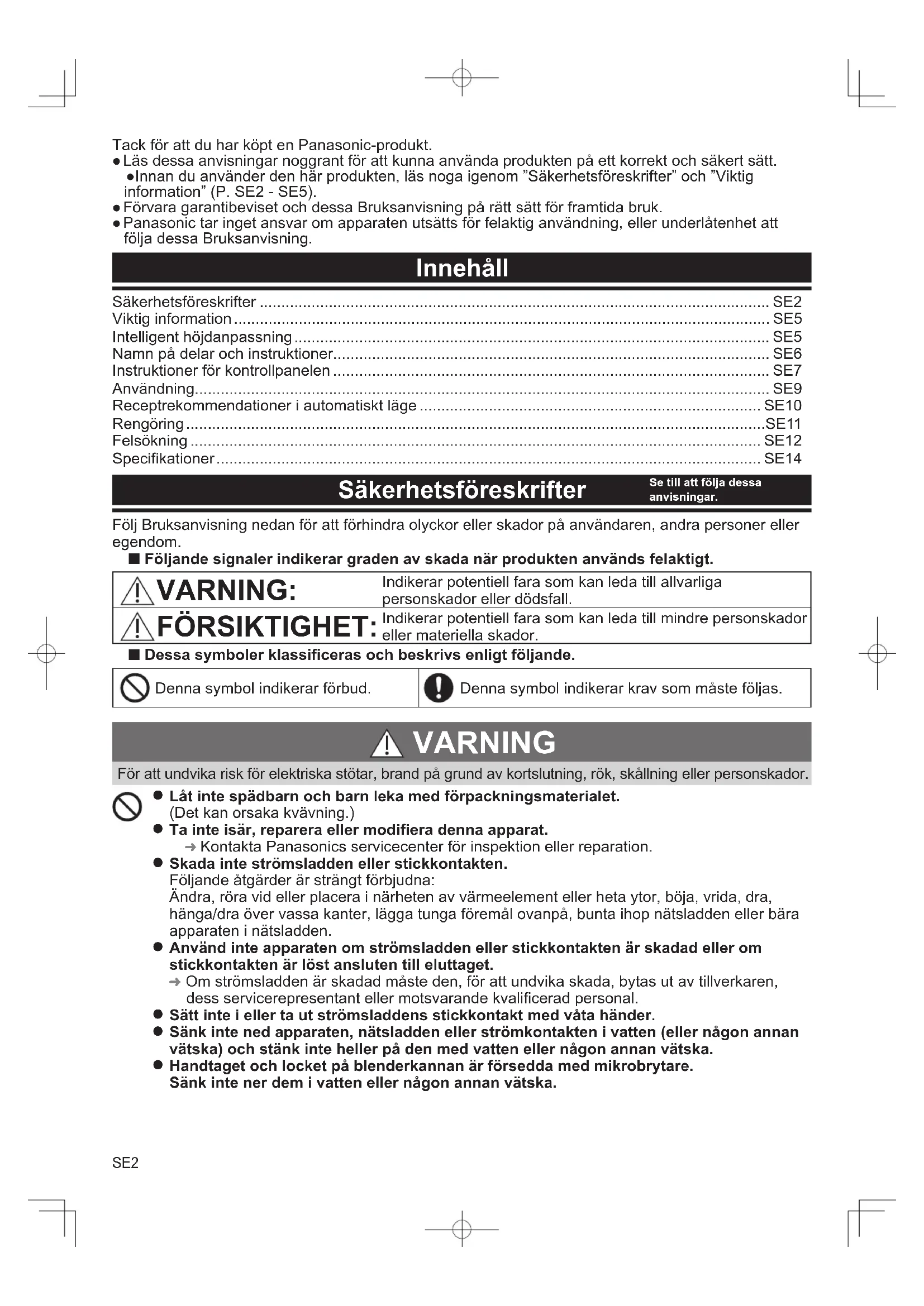 Handtaget och locket på blenderkannan är försedda med mikrobrytare. Sänk inte ner dem i vatten eller någon annan vätska. Se till att följa dessa anvisningar.SE3 Svenska VARNING