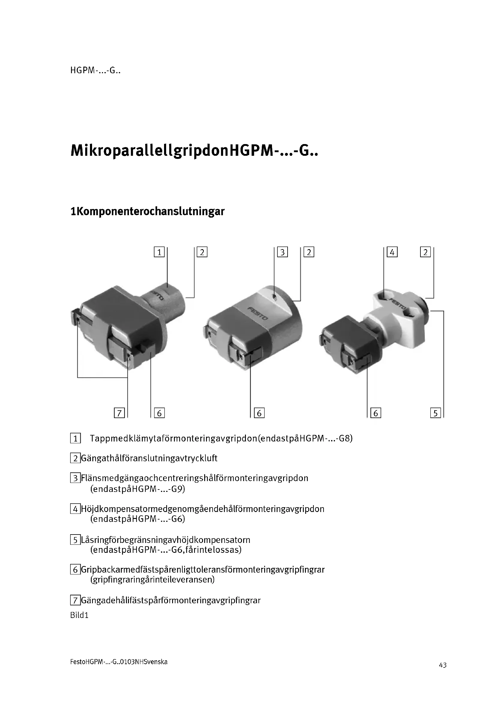 Tapp med klämyta för montering av gripdon (endast på HGPM-...-G8) 2 Gängat hål för anslutning av t ryckluft 3 Fläns med gänga och centreringshål för montering av gripdon (endast på HGPM-...-G9) 4 Höjdkompensator med genomgående hål för montering av gripdon (endast på HGPM-...-G6) 5 Låsring för begränsning av höjdkompensatorn (endast på HGPM-...-G6, får inte lossas) 6 Gripbackar med fästspår enligt tolerans för montering av gripfingrar (gripfingrar ingår inte i leveransen) 7 Gängade hål i fästspår för montering av gripfingrar Bild 1HGPM-...-G.. Festo HGPM-...-G.. 0103NH Svenska