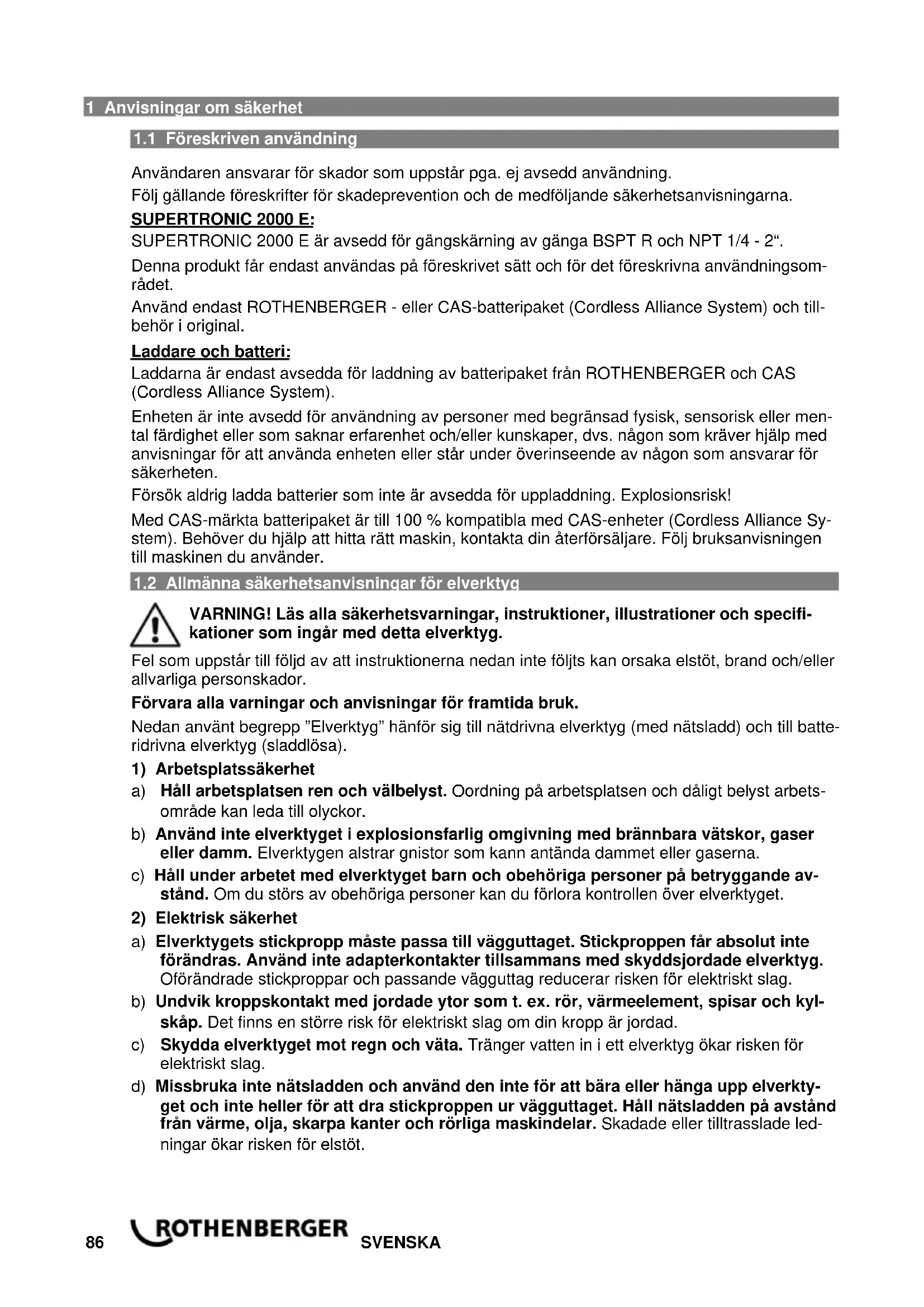 Användaren ansvarar för skador som uppstår pga. ej avsedd användning. Följ gällande föreskrifter för skadeprevention och de medföljande säkerhetsanvisningarna. SUPERTRONIC 2000 E: SUPERTRONIC 2000 E är avsedd för gängskärning av gänga BSPT R och NPT 1/4 - 2“. Denna produkt får endast användas på föreskrivet sätt och för det föreskrivna användningsom- rådet. Använd endast ROTHENBERGER - eller CAS-batteripaket (Cordless Alliance System) och till- behör i original. Laddare och batteri: Laddarna är endast avsedda för laddning av batteripaket från ROTHENBERGER och CAS (Cordless Alliance System). Enheten är inte avsedd för användning av personer med begränsad fysisk, sensorisk eller men- tal färdighet eller som saknar erfarenhet och/eller kunskaper, dvs. någon som kräver hjälp med anvisningar för att använda enheten eller står under överinseende av någon som ansvarar för säkerheten. Försök aldrig ladda batterier som inte är avsedda för uppladdning. Explosionsrisk! Med CAS-märkta batteripaket är till 100 % kompatibla med CAS-enheter (Cordless Alliance Sy- stem). Behöver du hjälp att hitta rätt maskin, kontakta din återförsäljare. Följ bruksanvisningen till maskinen du använder.