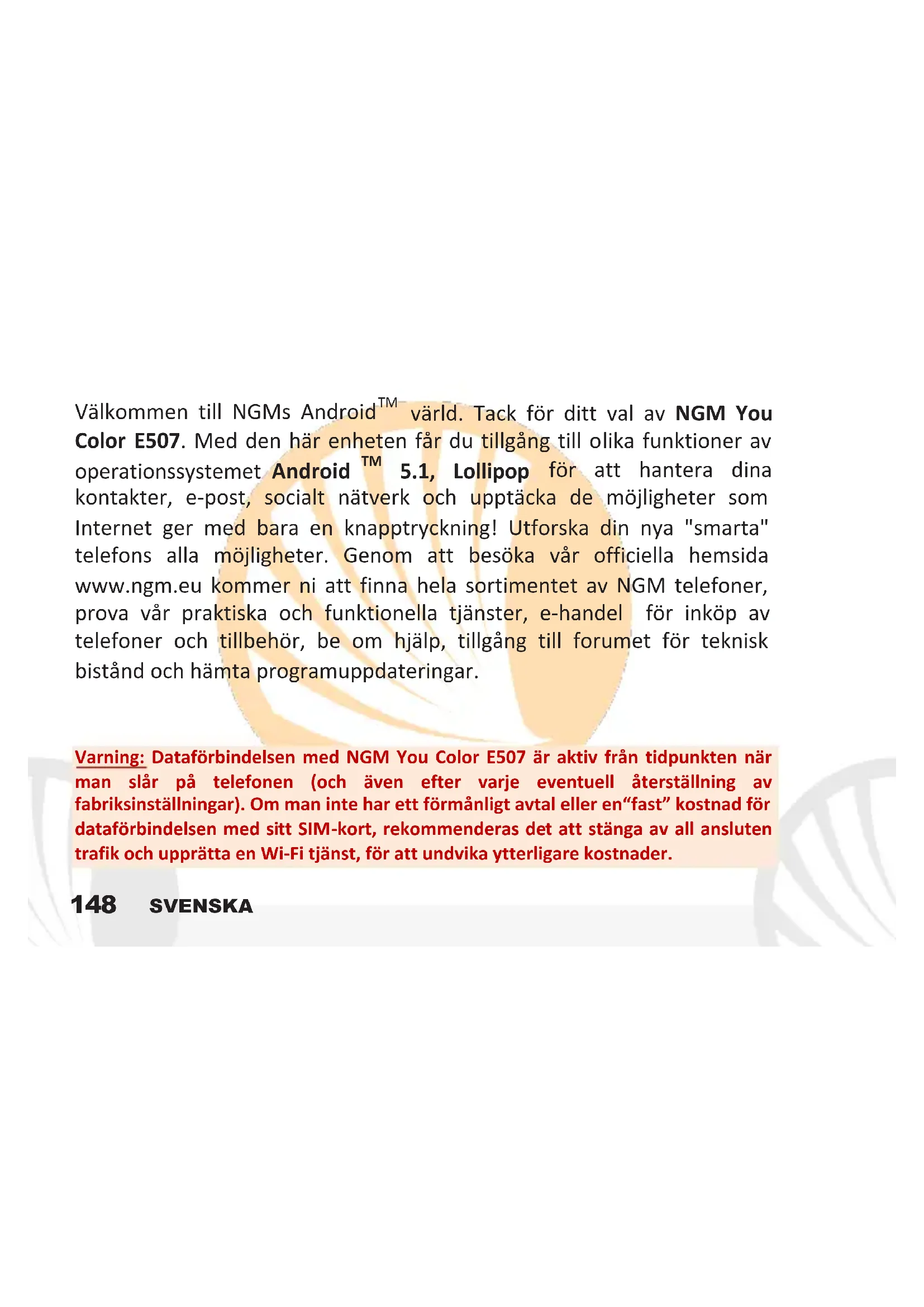 5.1, Lollipop för att hantera dina kontakter, e-post, socialt nätverk och upptäcka de möjligheter som Internet ger med bara en knapptryckning! Utforska din nya "smarta" telefons alla möjligheter. Genom att besöka vår officiella hemsida www.ngm.eu kommer ni att finna hela sortimentet av NGM telefoner, prova vår praktiska och funktionella tjänster, e-handel för inköp av telefoner och tillbehör, be om hjälp, tillgång till forumet för teknisk bistånd och hämta programuppdateringar.