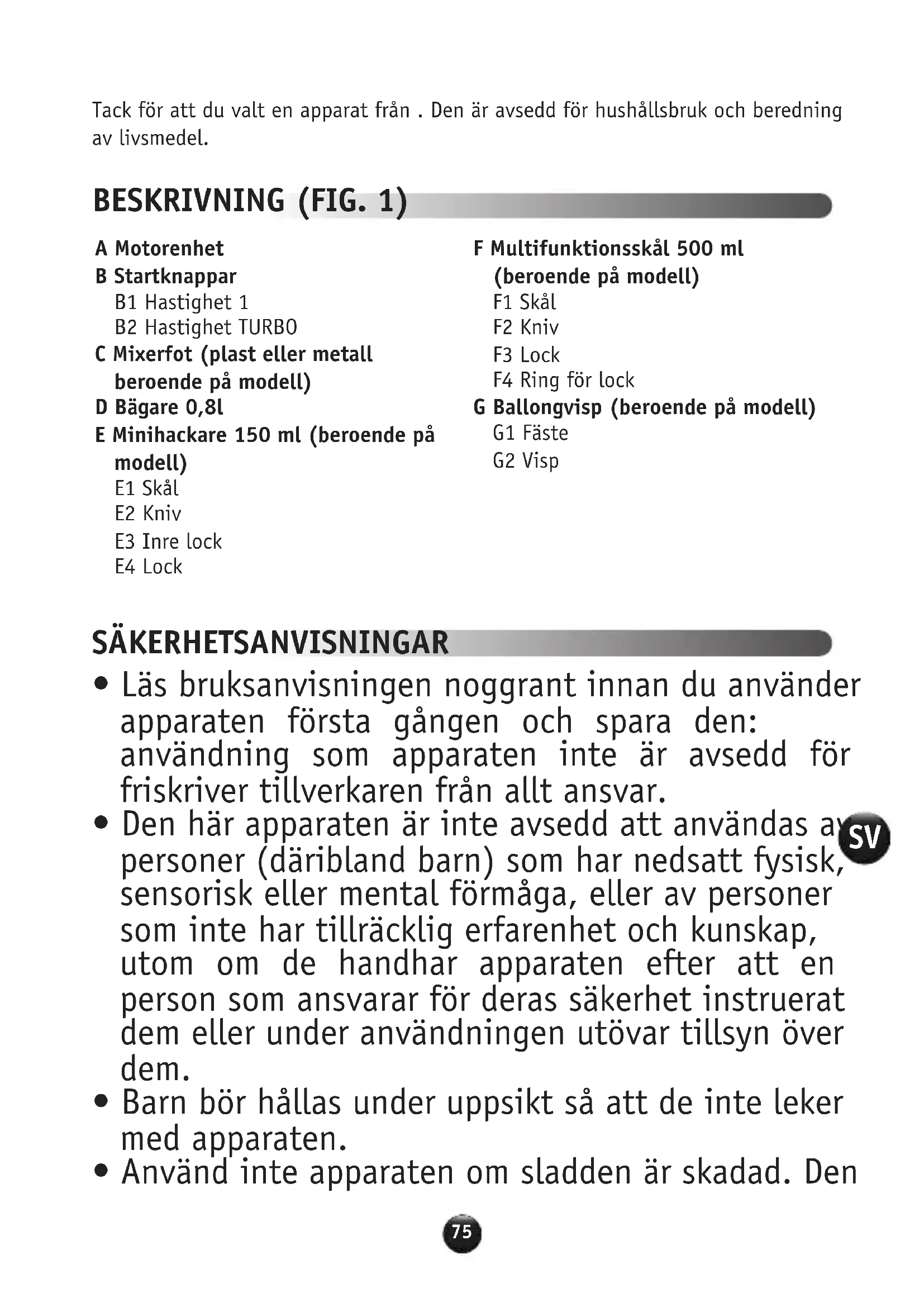 Tack för att du valt en apparat från . Den är avsedd för hushållsbruk och beredning av livsmedel. BESKRIVNING (FIG. 1) SÄKERHETSANVISNINGAR