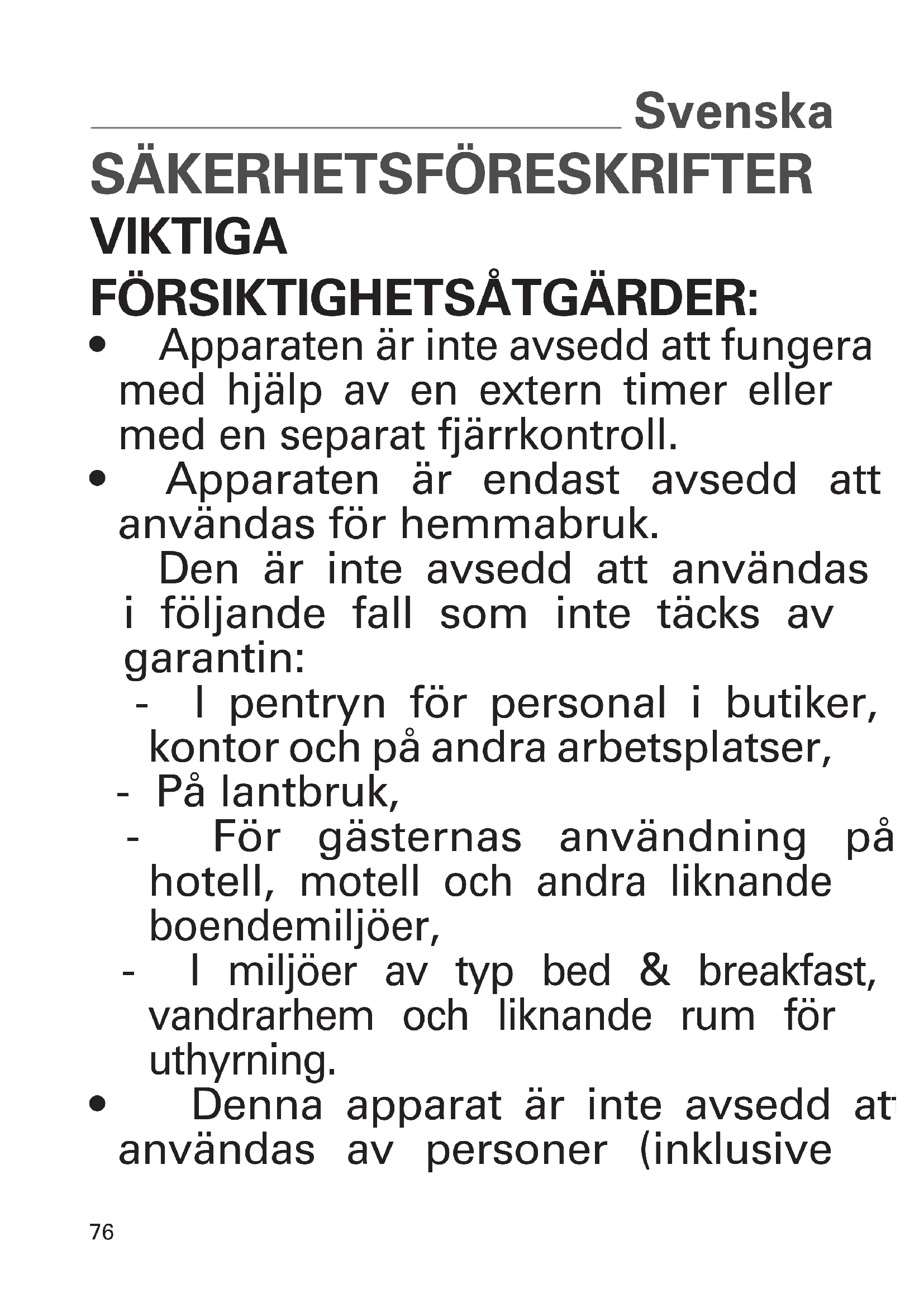 - Apparaten är endast avsedd att användas för hemmabruk. Den är inte avsedd att användas i följande fall som inte täcks av garantin: - I pentryn för personal i butiker, kontor och på andra arbetsplatser, - På lantbruk, - För gästernas användning på hotell, motell och andra liknande boendemiljöer,