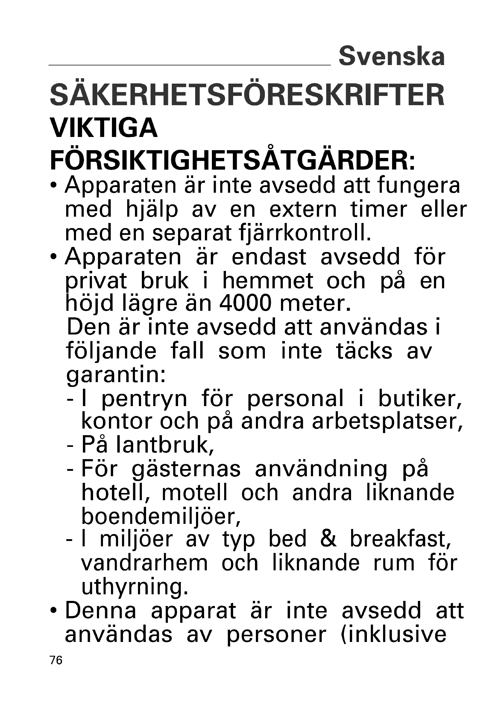 - Apparaten är endast avsedd för privat bruk i hemmet och på en höjd lägre än 4000 meter. Den är inte avsedd att användas i följande fall som inte täcks av garantin: - I pentryn för personal i butiker, kontor och på andra arbetsplatser, - På lantbruk, - För gästernas användning på hotell, motell och andra liknande boendemiljöer,
