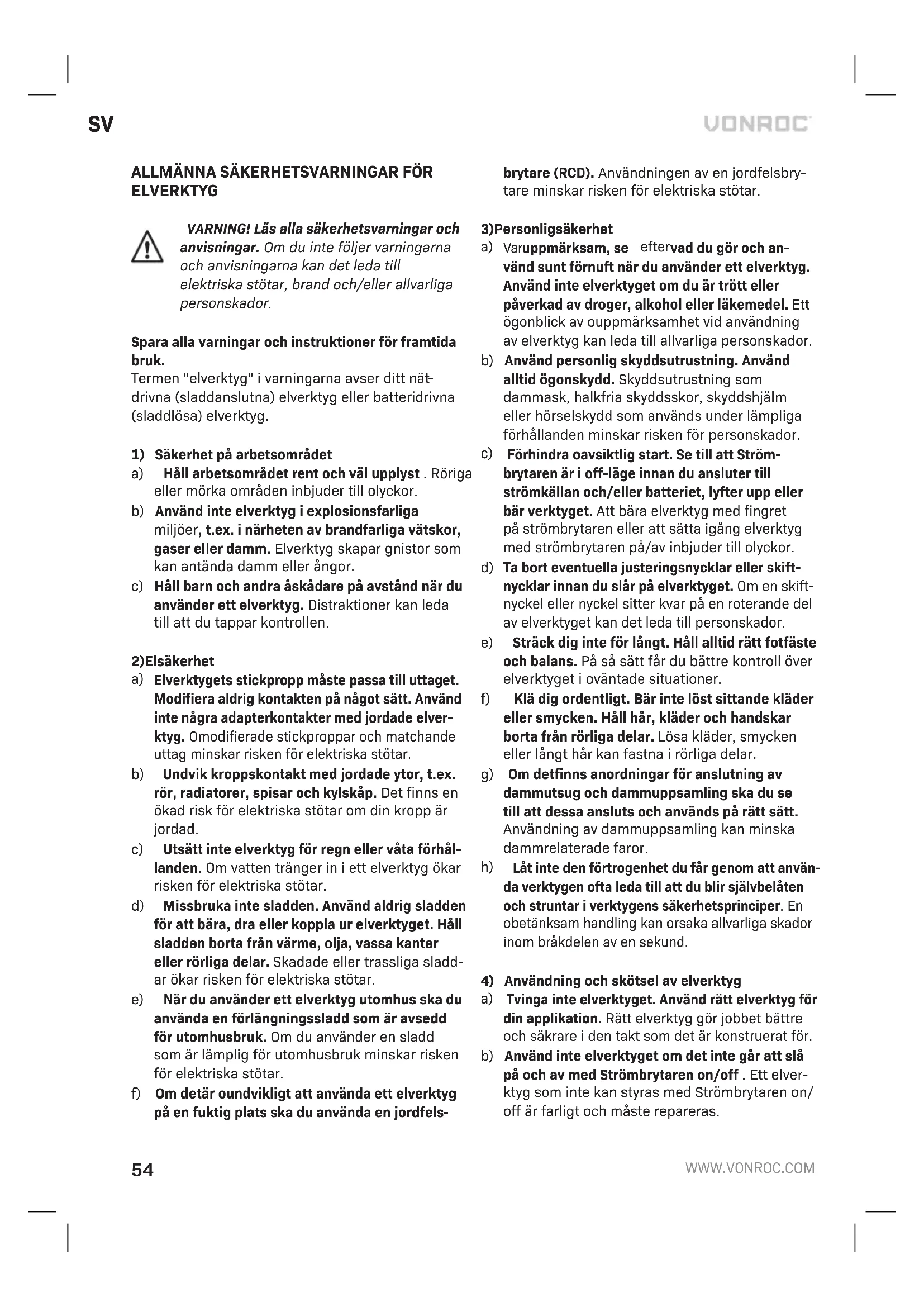 Före rengöring och underhåll ska du alltid stänga av maskinen och ta ut batteripaketet ur maskinen. Rengör maskinens hölje regelbundet med en mjuk trasa, helst efter varje användningstillfälle. Se till att ventilationsöppningarna är fria från damm och smuts. Avlägsna mycket hårt sittande smuts med en mjuk trasa fuktad med såpvatten. Använd inga lösningsmedel som bensin, alkohol, ammoniak osv. Kemikalier som dessa skadar de syntetiska komponenterna. GARANTI VONROC produkter är utvecklade enligt högsta kvalitetsstandard och garanteras fria från defekter i både material och utförande under den period som lagligen föreskrivs från och med datumet för det ursprungliga köpet. Om produkten under denna period skulle visa sig vara felaktig på grund av defekt material och/eller utförande, kontakta VONROC direkt. Följande omständigheter är undantagna från denna garanti: - Reparationer och eller ändringar har utförts eller försökts på maskinen av icke auktoriserade serviceverkstäder; - Normalt slitage; - Verktyget har misshandlats, använts felaktigt eller underhållits på felaktigt sätt; - Reservdelar som inte är original har använts. Detta utgör den enda garanti som företaget lämnar, vare sig den är uttrycklig eller underförstådd. Det finns inga andra garantier uttryckta eller underförstådda som sträcker sig längre än vad som anges i detta dokument, inklusive underförstådda garantier för säljbarhet och lämplighet för ett visst ändamål. VONROC ska under inga omständigheter hållas ansvarigt för tillfälliga skador eller följdskador. Återförsäljarens åtgärder ska begränsas till reparation eller utbyte av enheter eller delar som inte överensstämmer med kraven. Produkten och användarhandboken kan komma att ändras. Specifikationerna kan ändras utan föregående meddelande.FI