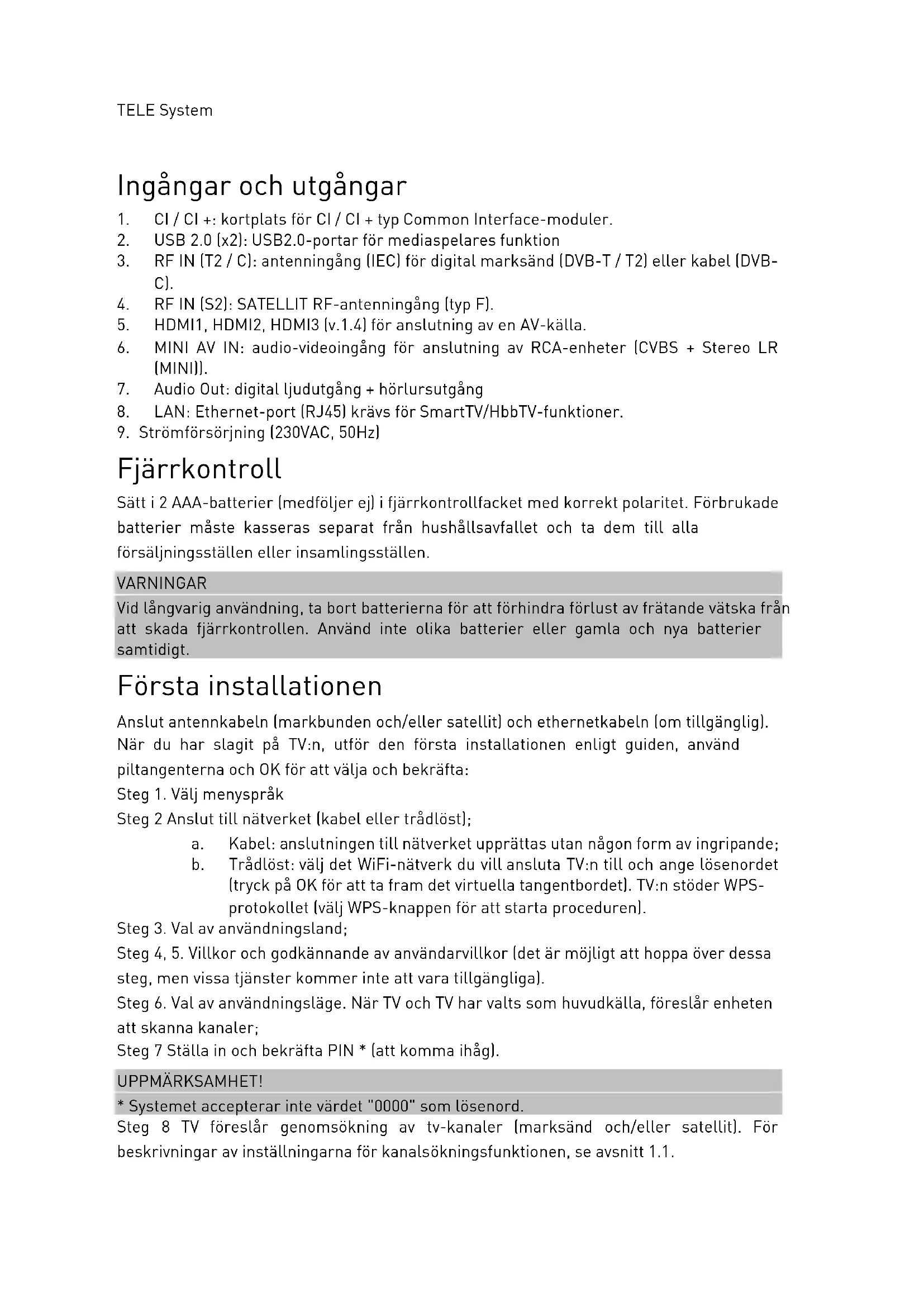 Fjärrkontroll Sätt i 2 AAA-batterier (medföljer ej) i fjärrkontrollfacket med korrekt polaritet. Förbrukade batterier måste kasseras separat från hushållsavfallet och ta dem till alla försäljningsställen eller insamlingsställen. VARNINGAR Vid långvarig användning, ta bort batterierna för att förhindra förlust av frätande vätska från att skada fjärrkontrollen. Använd inte olika batterier eller gamla och nya batterier samtidigt. Första installationen Anslut antennkabeln (markbunden och/eller satellit) och ethernetkabeln (om tillgänglig). När du har slagit på TV:n, utför den första installationen enligt guiden, använd piltangenterna och OK för att välja och bekräfta: Steg 1. Välj menyspråk Steg 2 Anslut till nätverket (kabel eller trådlöst); a. Kabel: anslutningen till nätverket upprättas utan någon form av ingripande; b. Trådlöst: välj det WiFi-nätverk du vill ansluta TV:n till och ange lösenordet (tryck på OK för att ta fram det virtuella tangentbordet). TV:n stöder WPS- protokollet (välj WPS-knappen för att starta proceduren). Steg 3. Val av användningsland; Steg 4, 5. Villkor och godkännande av användarvillkor (det är möjligt att hoppa över dessa steg, men vissa tjänster kommer inte att vara tillgängliga). Steg 6. Val av användningsläge. När TV och TV har valts som huvudkälla, föreslår enheten att skanna kanaler; Steg 7 Ställa in och bekräfta PIN * (att komma ihåg). UPPMÄRKSAMHET!