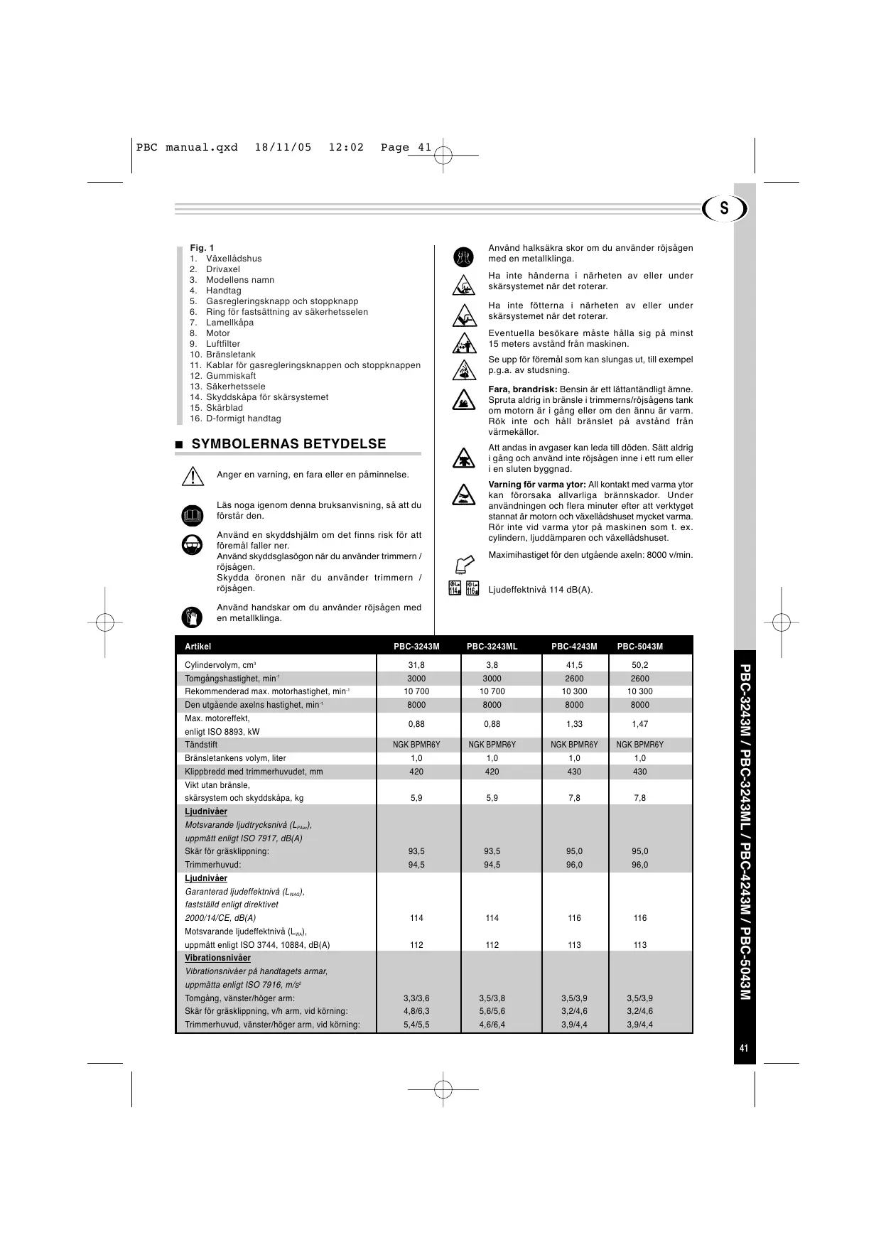 SYMBOLERNAS BETYDELSE Använd halksäkra skor om du använder röjsågen med en metallklinga. Ha inte händerna i närheten av eller under skärsystemet när det roterar. Ha inte fötterna i närheten av eller under skärsystemet när det roterar. Eventuella besökare måste hålla sig på minst 15 meters avstånd från maskinen. Se upp för föremål som kan slungas ut, till exempel p.g.a. av studsning. Fara, brandrisk: Bensin är ett lättantändligt ämne. Spruta aldrig in bränsle i trimmerns/röjsågens tank om motorn är i gång eller om den ännu är varm. Rök inte och håll bränslet på avstånd från värmekällor. Att andas in avgaser kan leda till döden. Sätt aldrig i gång och använd inte röjsågen inne i ett rum eller i en sluten byggnad. Anger en varning, en fara eller en påminnelse. Läs noga igenom denna bruksanvisning, så att du förstår den. Använd en skyddshjälm om det finns risk för att föremål faller ner. Använd skyddsglasögon när du använder trimmern / röjsågen. Skydda öronen när du använder trimmern / röjsågen. Varning för varma ytor: All kontakt med varma ytor kan förorsaka allvarliga brännskador. Under användningen och flera minuter efter att verktyget stannat är motorn och växellådshuset mycket varma. Rör inte vid varma ytor på maskinen som t. ex. cylindern, ljuddämparen och växellådshuset. Maximihastiget för den utgående axeln: 8000 v/min. Ljudeffektnivå 114 dB(A). Använd handskar om du använder röjsågen med en metallklinga. Artikel Garanterad ljudeffektnivå (LWAG), fastställd enligt direktivet 2000/14/CE, dB(A) Motsvarande ljudeffektnivå (LWA), uppmätt enligt ISO 3744, 10884, dB(A) Vibrationsnivåer Vibrationsnivåer på handtagets armar, uppmätta enligt ISO 7916, m/s2 Tomgång, vänster/höger arm: Skär för gräsklippning, v/h arm, vid körning: Trimmerhuvud, vänster/höger arm, vid körning: PBC-3243M PBC-3243ML PBC-4243M PBC-5043M 31,8