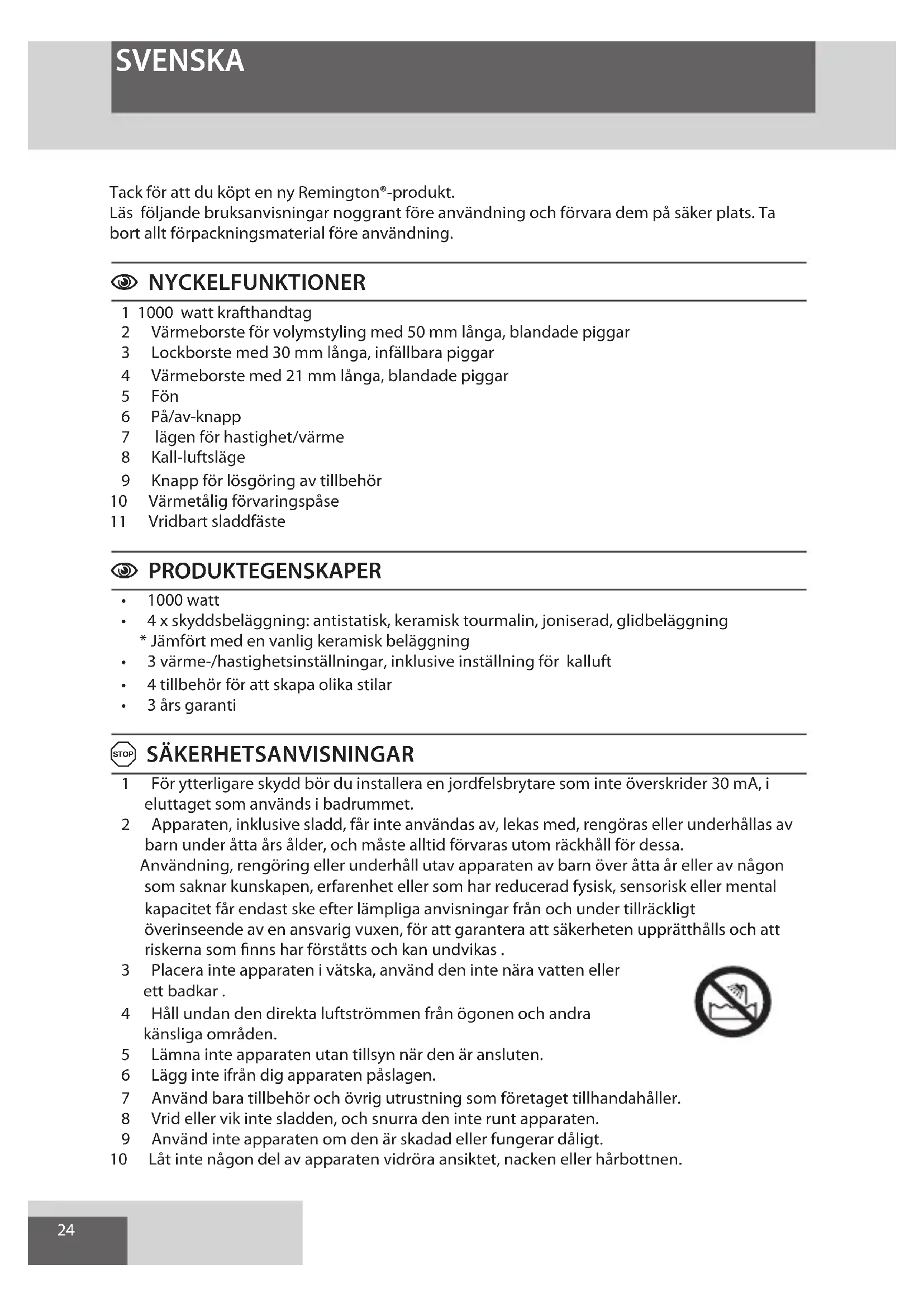 Produktenharkontrolleratsochärutanfel. Vigaranterarattdennaproduktinteharnågrafelsomuppkommitpågrundavmaterialfel ellertillverkningsfelundergarantiperiodenfråninköpstillfälletpåoriginalkvittot. Skulleproduktenfungerafelaktigtföregarantiperiodensutgång,reparerarvidefekteneller väljerattersättaproduktenellernågondelavdenutanextrakostnad,underförutsättning attinköpsbevis/kvittokanuppvisas. Dettainnebärinteenförlängningavgarantiperioden. Ringdittlokalaservicecentervidutnyttjandeavgarantin. Dennagarantigällerutöverochunderlängretidändinanormalakonsumenträttigheter. Garantingälleriallaländerdärvårproduktsäljsviaenauktoriseradåterförsäljare. Dennagarantiinkluderarinteskadorpåproduktensomuppkommitpågrundavolycka ellerfelaktiganvändning,påverkan,ändringarpåproduktenelleranvändningsominteföljt detekniskaoch/ellersäkerhetsanvisningarsomangivits. Garantinupphörattgällaomproduktenmonterasisärellerreparerasavenpersonsominte auktoriserats av oss. Omduringerservicecentretbervidighamodellnumrettillhands,dåvibehöverdetföratt kunnahjälpadig. Dunnernumretpåmärkplattanpåapparaten.27 SUOMI Kiitämme,ettävalitsittämänuudenRemington®-tuotteen. Luenämäohjeethuolellisestiennentuotteenkäyttöäjasäilytäneturvallisessapaikassa. Poistakaikkipakkausmateriaaliennenkäyttöä.