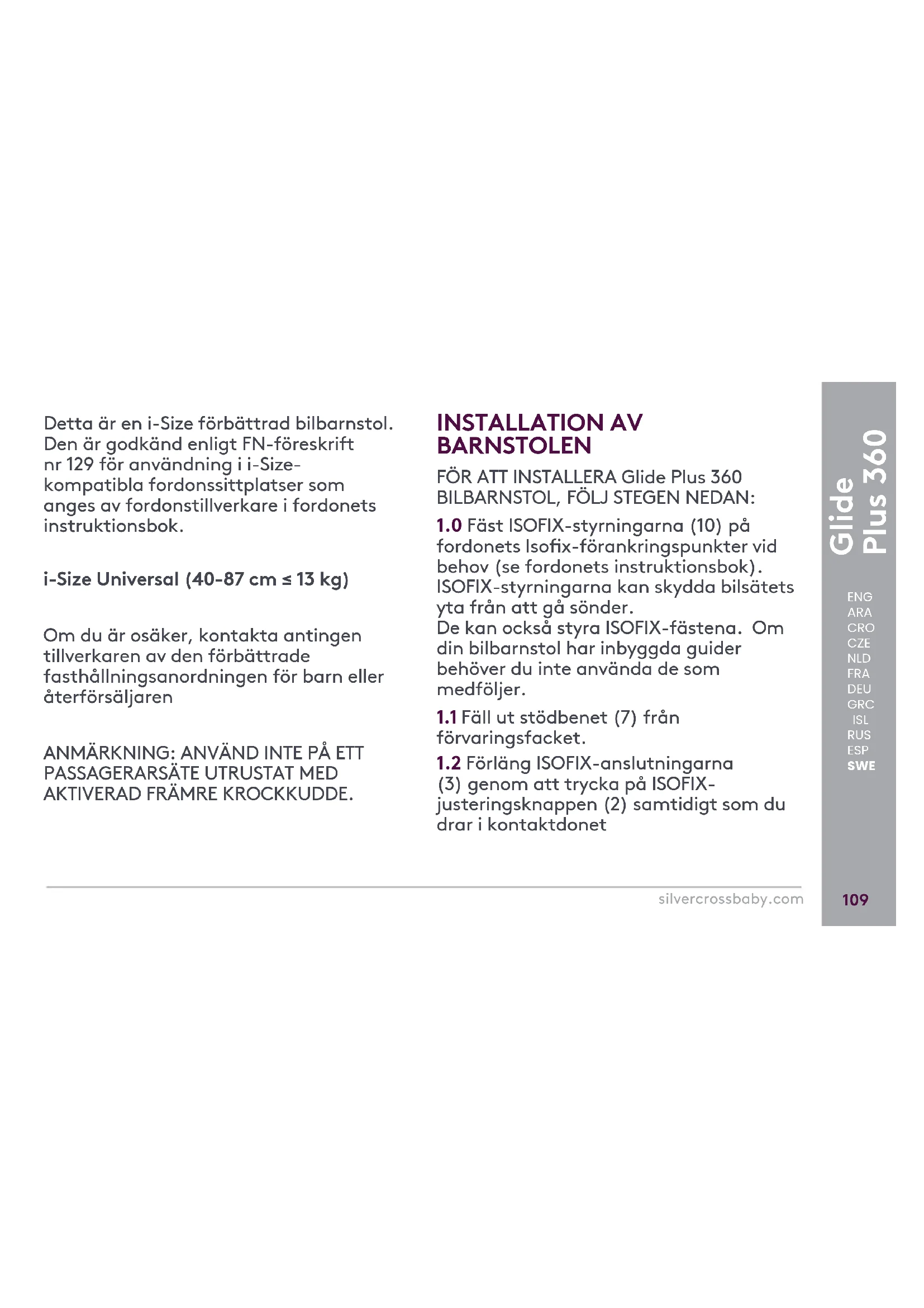 fordonssätet, tryck först på de sekundära låsknapparna och tryck sedan på Isox- frigöringsknapparna (2) på ISOFIX- fästena (3) innan du tar bort basen från fordonssätet. Skjut tillbaka ISOFIX- fästena (3) när basplattan inte används. ENG ARA CRO CZE NLD FRA DEU GRC ISL RUS ESP SWEGlide Plus 360 silvercrossbaby.com