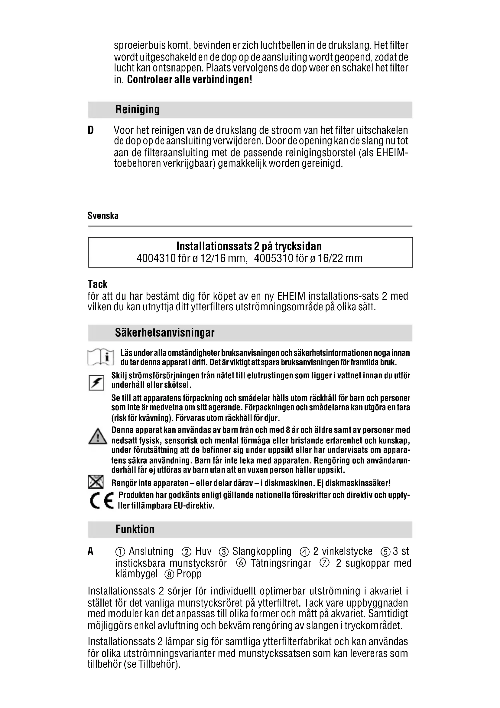 Propp Installationssats 2 sörjer för individuellt optimerbar utströmning i akvariet i stället för det vanliga munstycksröret på ytterfiltret. Tack vare uppbyggnaden med moduler kan det anpassas till olika former och mått på akvariet. Samtidigt möjliggörs enkel avluftning och bekväm rengöring av slangen i tryckområdet. Installationssats 2 lämpar sig för samtliga ytterfilterfabrikat och kan användas för olika utströmningsvarianter med munstyckssatsen som kan levereras som tillbehör (se Tillbehör). Tack för att du har bestämt dig för köpet av en ny EHEIM installations-sats 2 med vilken du kan utnyttja ditt ytterfilters utströmningsområde på olika sätt. Funktion Reiniging D Voor het reinigen van de drukslang de stroom van het filter uitschakelen de dop op de aansluiting verwijderen. Door de opening kan de slang nu tot aan de filteraansluiting met de passende reinigingsborstel (als EHEIM- toebehoren verkrijgbaar) gemakkelijk worden gereinigd. sproeierbuis komt, bevinden er zich luchtbellen in de drukslang. Het filter wordt uitgeschakeld en de dop op de aansluiting wordt geopend, zodat de lucht kan ontsnappen. Plaats vervolgens de dop weer en schakel het filter in. Controleer alle verbindingen! Läs under alla omständigheter bruksanvisningen och säkerhetsinformationen noga innan du tar denna apparat i drift. Det är viktigt att spara bruksanvisningen för framtida bruk. Skilj strömsförsörjningen från nätet till elutrustingen som ligger i vattnet innan du utför underhåll eller skötsel. Se till att apparatens förpackning och smådelar hålls utom räckhåll för barn och personer som inte är medvetna om sitt agerande. Förpackningen och smådelarna kan utgöra en fara (risk för kvävning). Förvaras utom räckhåll för djur. Denna apparat kan användas av barn från och med 8 år och äldre samt av personer med nedsatt fysisk, sensorisk och mental förmåga eller bristande erfarenhet och kunskap, under förutsättning att de befinner sig under uppsikt eller har undervisats om appara- tens säkra användning. Barn får inte leka med apparaten. Rengöring och användarun- derhåll får ej utföras av barn utan att en vuxen person håller uppsikt. Rengör inte apparaten – eller delar därav – i diskmaskinen. Ej diskmaskinssäker! Produkten har godkänts enligt gällande nationella föreskrifter och direktiv och uppfy- ller tillämpbara EU-direktiv.Norsk Installasjonssett 2 på trykksiden 4004310 for ø 12/16 mm, 4005310 for ø 16/22 mm Mange takk for innkjøpet av ditt nye EHEIM installasjonssett 2, som gir deg muligheten til å nyttiggjøre utstrømningsområdet til ditt utvendige filter på mange forskjel- lige måter. Sikkerhetsinstrukser Rengöring D För rengöring av tryckslangen skall filtret skiljas från nätet och huven på anslutningen tas av. Genom öppningen kan nu slangen lätt rengöras ända till filteranslutningen med en lämplig rengöringsborste (finns som EHEIM tillbehör). Driftstart C Skilj ytterfiltret från nätet. Anslut filtrets tryckslang med den monterade slangkopplingen och kontrollera att huven på anslutningen är ordentligt tillsluten. Därefter kan filtret tas i drift igen. Avluftning: Om vattenutsläppet på munstycksröret fortfarande sprutar oregelbundet efter några minuter finns det luftblåsor i tryckslangen. Filtret stängs av och huven på anslutningen öppnas så att luften kan strömma ut. Slut därefter till huven igen och sätt på filtret. Kontrollera alla anslutningar! Montering B Installationssats 2 byts ut mot den vanliga munstycksrörkopplingen på trycksidan på ditt ytterfilter. Sätt i tätningsringarna på vinkelstycke och munstycksrör i spåren som är avsedda för dem. Sätt därefter ihop anslut- ning, vinkelstycke, munstycksrör och propp. Med hjälp av sugkopparna fästes setet i önskat utströmningsområde på insidan av akvariet. Via den iskruvade slangkopplingen ansluts slangförbindningen mellan anslutning och filteranslutning på trycksidan. Før utstyret tas i bruk er det viktig at du leser og følger bruksanvisningen og sikker- hetsanvisningene. Husk å ta godt vare på bruksanvisningen. Ved vedlikeholdsarbeider og pleie må alle de elektroapparatene som befinner seg i van- net skilles fra nettet. Apparatets emballasje og små deler må ikke falle i hendene på barn eller personer som ikke er seg bevisst sine handlinger, ettersom det kan utgå risikoer fra den (fare for kvelning!). Skal holdes på avstand fra dyr. Dette apparatet kan brukes av barn over 8 år samt personer med begrensede fysiske, sensoriske eller mentale evner, eller som mangler erfaring og kunnskap, når de er under oppsikt eller opplæring i sikker bruk av apparatet og dermed forstår de medfølgen- de farene. Barn må ikke leke med apparatet. Rengjøring og vedlikehold må ikke utføres av barn uten oppsikt.Montering B InstallasjonsSETT 2 skiftes ut med den vanlige dyserørforbindelsen på trykksiden til ditt utvendige filter. Sett tetningsringene på vinkelstykke og dyserør inn i de tilhørende notene. Deretter settes tilkopling, vinkelstykke, dyserør og støpsel sammen. Med hjelp av sugerne festes settet i det ønskede utstrømningsområdet på innsiden av akvariet. Over den innskrudde slangekoplingen opprettes nå slangeforbindelsen mellom tilkoplingen og filtertilkoplingen på trykksiden. Igangsettelse C Skill det utvendige filteret fra nettet. Kople filterets trykkslange til med den monterte slangekoplingen og kontroller om kappen på tilkoplingen er godt lukket. Deretter kan filteret settes i drift igjen. Lufting: Dersom vannutløpet på dyserøret etter noen minutter ennå spruter uregelmessig, befinner det seg luftblærer i trykkslangen. Filteret må da slås av og kappen på tilkoplingen må åpnes, slik at luften kan slip- pe ut. Deretter lukkes kappen igjen og filteret slås på. Kontroller alle forbindelser! Rengjøring D For å rengjøre trykkslangen, må filteret skilles fra nettet og kappen på tilk