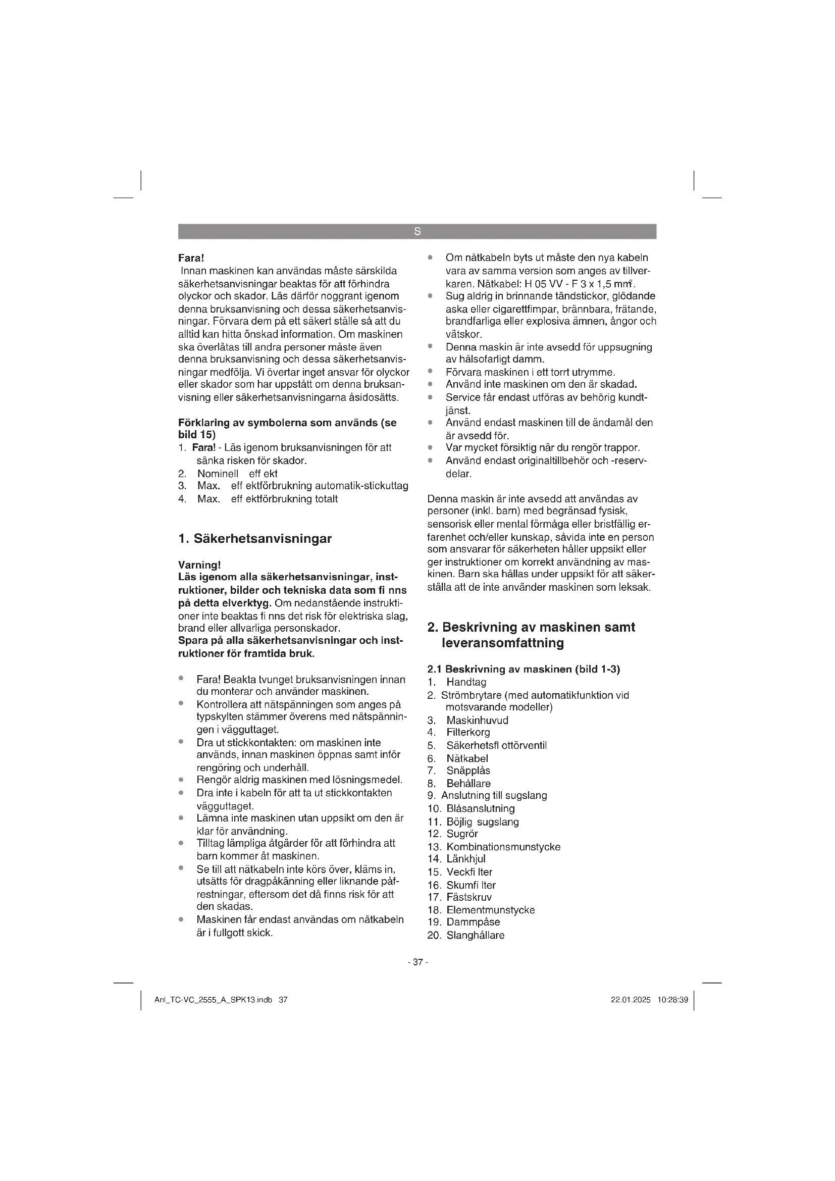 Fara! Om nätkabeln till denna produkt har skadats mås- te den bytas ut av tillverkaren, kundtjänst eller av en annan person med liknande behörighet efter- som det annars fi nns risk för personskador. Anl_TC-VC_2555_A_SPK13.indb 39Anl_TC-VC_2555_A_SPK13.indb 39 22.01.2025 10:28:4022.01.2025 10:28:40S
