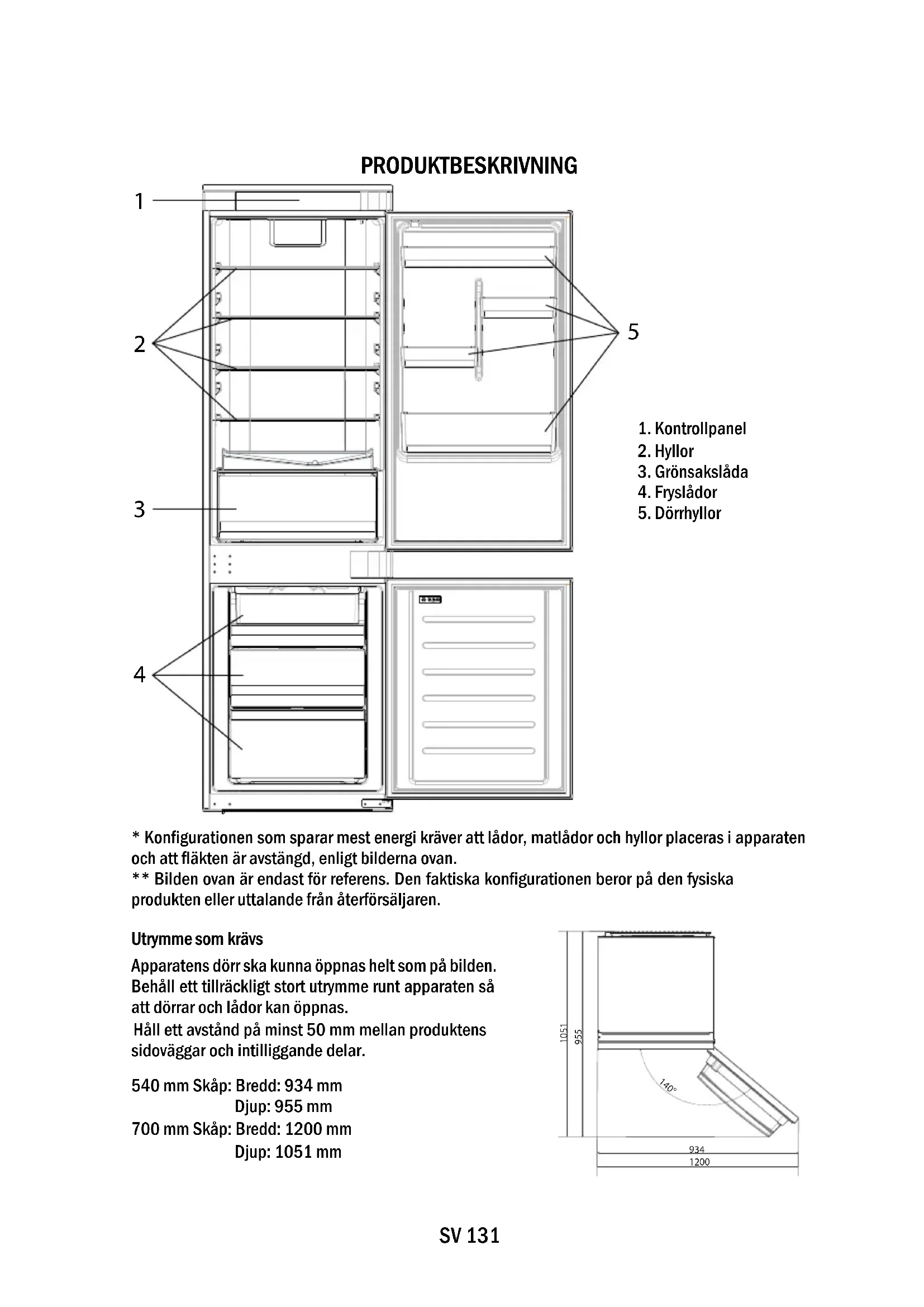 140° Apparatens dörr ska kunna öppnas helt som på bilden. Behåll ett tillräckligt stort utrymme runt apparaten så att dörrar och lådor kan öppnas. Håll ett avstånd på minst 50 mm mellan produktens sidoväggar och intilliggande delar. 540 mm Skåp: Bredd: 934 mm Djup: 955 mm 700 mm Skåp: Bredd: 1200 mm Djup: 1051 mm