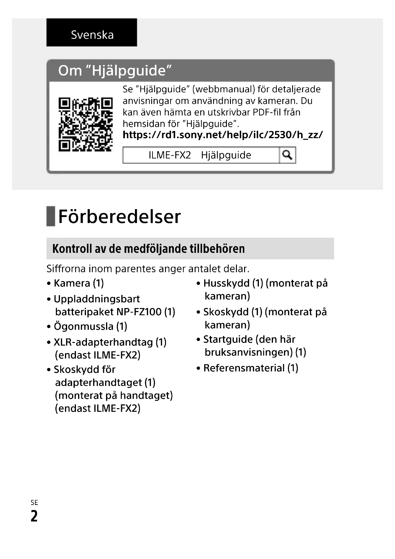 Om ”Hjälpguide” Se ”Hjälpguide” (webbmanual) för detaljerade anvisningar om användning av kameran. Du kan även hämta en utskrivbar PDF-fil från hemsidan för ”Hjälpguide”.https://rd1.sony.net/help/ilc/2530/h_zz/ILME-FX2 Hjälpguide Svenska Förberedelser Kontroll av de medföljande tillbehören Siffrorna inom parentes anger antalet delar.• Kamera (1)• Uppladdningsbart batteripaket NP-FZ100 (1)• Ögonmussla (1) • XLR-adapterhandtag (1) (endast ILME-FX2)• Skoskydd för adapterhandtaget (1) (monterat på handtaget) (endast ILME-FX2)• Husskydd (1) (monterat på kameran)• Skoskydd (1) (monterat på kameran)• Startguide (den här bruksanvisningen) (1)• Referensmaterial (1)SE