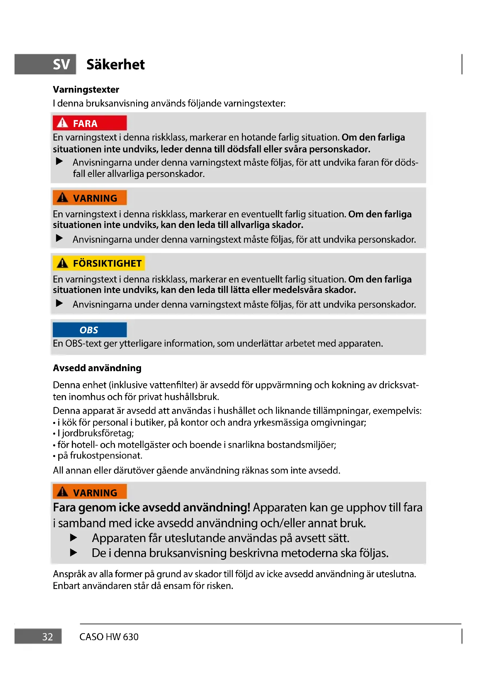 - Bezpieczeństwo elektryczne urządzenia jest zagwarantowane tylko wtedy, gdy jest ono podłączone do prawidłowo zainstalowanego systemu przewodów ochronnych. W razie wątpliwości zlecić sprawdzenie instalacji domowej przez elektryka. Producent nie ponosi odpowiedzialności za uszkodzenia spowodowane przez brak lub przerwa- nie przewodu ochronnego.32 CASO HW 630 SV Säkerhet Varningstexter I denna bruksanvisning används följande varningstexter: FARA En varningstext i denna riskklass, markerar en hotande farlig situation. Om den farliga situationen inte undviks, leder denna till dödsfall eller svåra personskador. f Anvisningarna under denna varningstext måste följas, för att undvika faran för döds- fall eller allvarliga personskador. VARNING En varningstext i denna riskklass, markerar en eventuellt farlig situation. Om den farliga situationen inte undviks, kan den leda till allvarliga skador. f Anvisningarna under denna varningstext måste följas, för att undvika personskador. FÖRSIKTIGHET En varningstext i denna riskklass, markerar en eventuellt farlig situation. Om den farliga situationen inte undviks, kan den leda till lätta eller medelsvåra skador. f Anvisningarna under denna varningstext måste följas, för att undvika personskador. OBS En OBS-text ger ytterligare information, som underlättar arbetet med apparaten. Avsedd användning Denna enhet (inklusive vattenlter) är avsedd för uppvärmning och kokning av dricksvat- ten inomhus och för privat hushållsbruk. Denna apparat är avsedd att användas i hushållet och liknande tillämpningar, exempelvis: