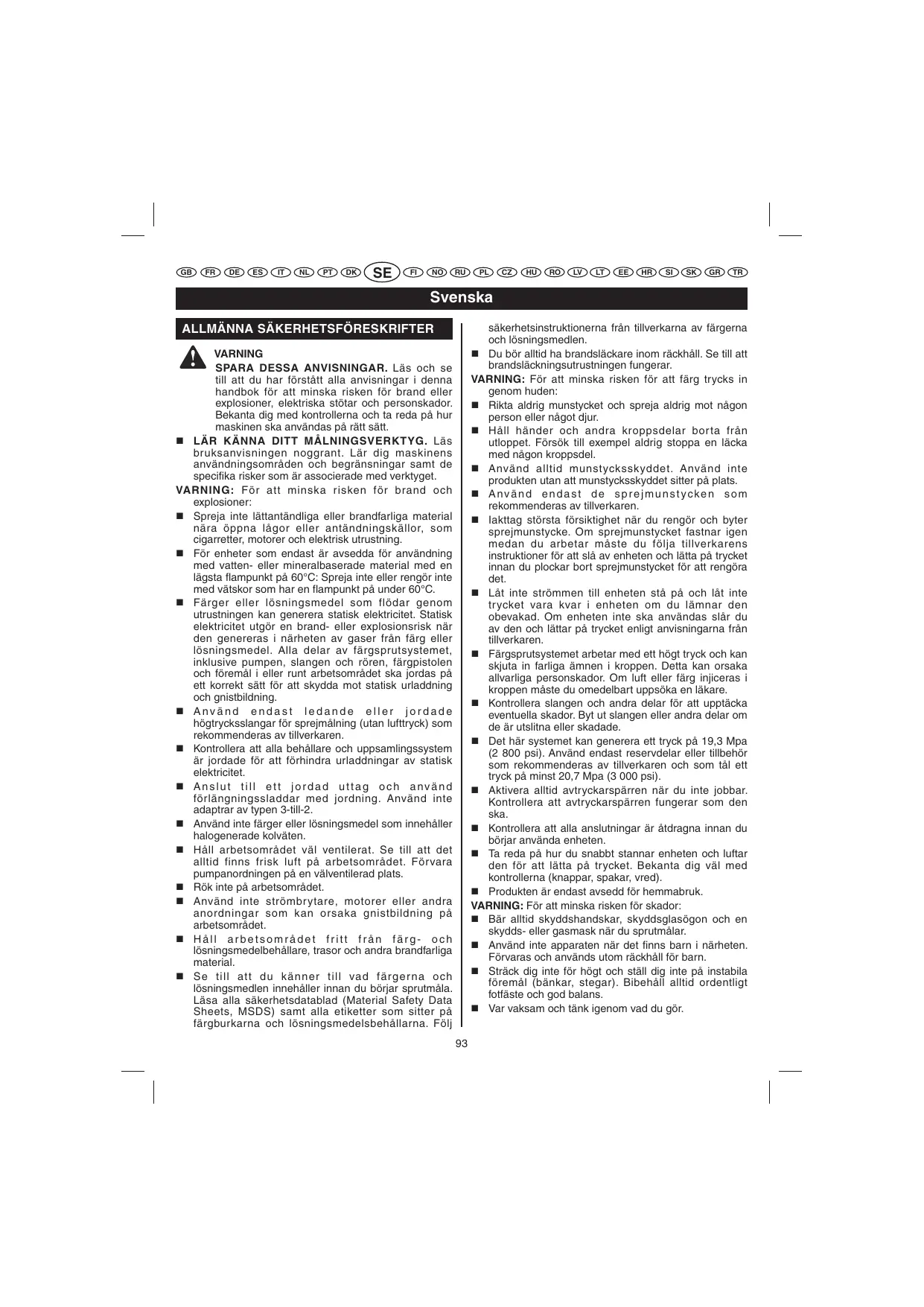 Gardez la zone de travail exempte de bidons de peinture ou de solvant, de chiffons, et autres éléments inflammables. Connaissez la composition des peintures et solvants vaporisés. Lisez toute la Fiche Technique SantéSécurité (MSDS) du produit et les étiquettes situées sur les bidons de peinture et de solvant. Respectez les instructions de sécurité du fabricant de peinture et de solvant. Des extincteurs doivent être présents et en état de fonctionner. AVERTISSEMENT: Pour réduire les risque d’injection dans la peau: Ne faites pas pointer le pistolet ou le jet vers des personnes ou des animaux. Eloignez les mains et les autres parties du corps de la sortie de déversement. Par exemple, ne tentez pas de stopper une fuite avec une partie quelconque de votre corps. Utilisez toujours la protection de buse. Ne vaporisez pas sans que la protection de buse ne soit en place. N’utilisez que les buses indiquées par le fabricant. Soyez prudent lors du nettoyage et du changement de buse. Au cas où la buse se boucherait au cours de l’utilisation, suivez les instructions du fabricant pour arrêter l’appareil et relâcher la pression avant de démonter la buse en vue de son nettoyage. Ne laissez pas l’appareil sans surveillance lorsqu’il est alimenté ou sous pression. Lorsque l’appareil n’est pas utilisé, arrêtez-le et relâchez la pression en suivant les indications du fabricant. Le jet haute pression est capable d’injecter des toxines dans le corps et de provoquer de graves blessures. En cas d’injection, contactez immédiatement un médecin. Vérifiez que les flexibles et autres éléments sont exempts de signes d’endommagement. Remplacez tout flexible ou élément endommagé. Ce système est capable de produire une pression de 19.3 MPa (2800 psi). N’utilisez que des accessoires ou pièces de rechange recommandés par le fabricant et conçus pour supporter au moins 20.7 MPa (3000 psi) de pression. Verrouillez toujours la gâchette hors des périodes d’utilisation. Vérifiez que le verrouillage de la gâchette fonctionne correctement. Vérifiez le bon verrouillage des raccords avant de mettre l’appareil en marche. Sachez comment rapidement arrêter l’appareil et en relâcher la pression. Familiarisez-vous avec les commandes.