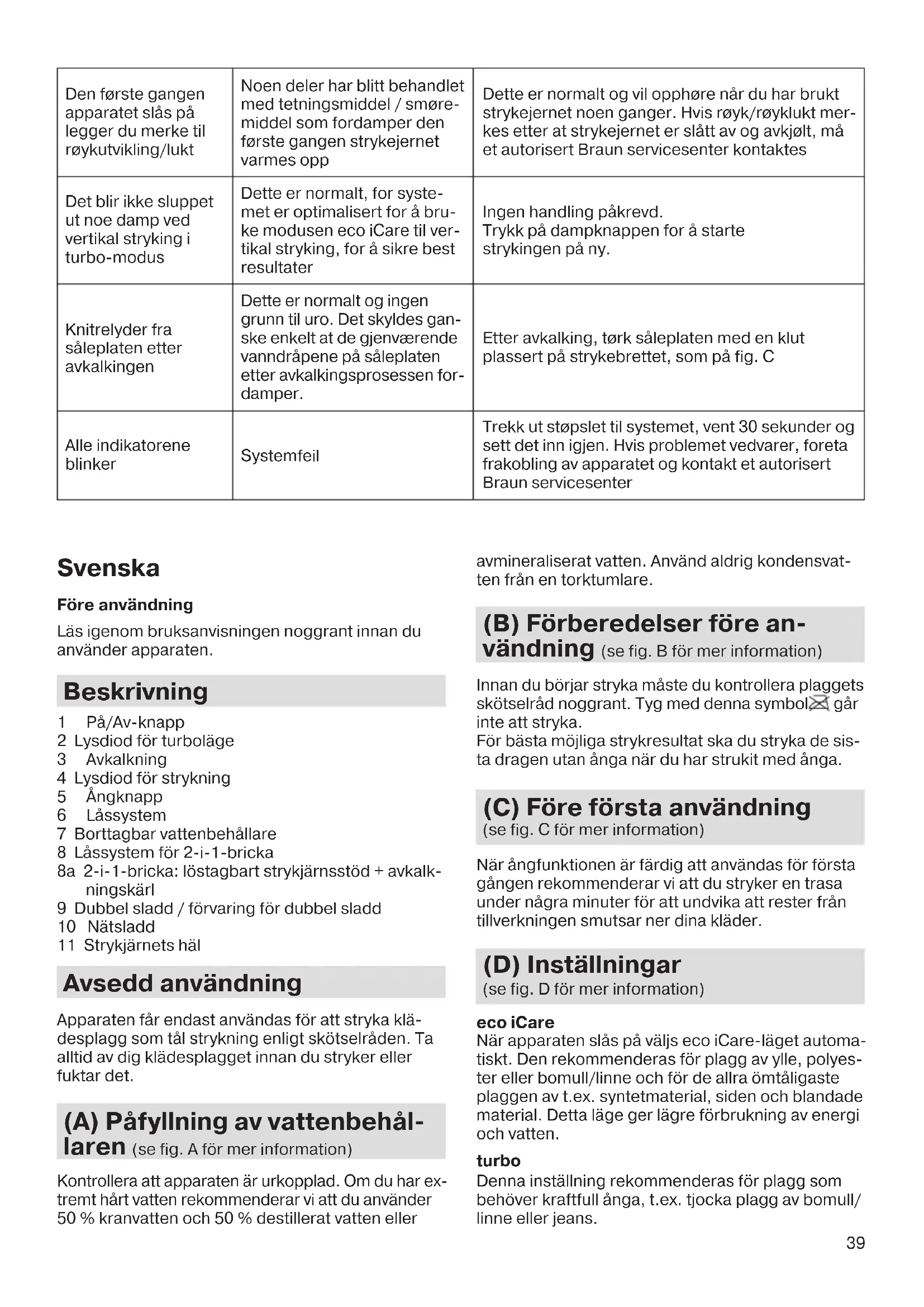 - For å låse opp strykejernet trykkes knappen på glideren (enkel lås) inn. Strykejernet frigjøres. Veiledning for feilsøking Problem Årsak Løsning Strykejernet produ- serer ikke noe damp Når du begynner å stryke har ikke dampknappen vært trykt inn lenge nok Når du begynner å stryke har ikke dampknappen vært trykt inn lenge nok Det er ikke nok vann i vanntanken Fyll vanntanken Dersom avkalkingsknappen slås på, vil dampfunksjonen være deaktivert til du har ut- ført avkalkingsprosessen Foreta avkalkingsprosessen (se F Avkalking) Strykejernet varmes opp Når strykeindikatoren blinker blir strykejernet varmet opp; i denne fasen vil dampfunksjonen være deaktivert. Vent til strykeindikatoren lyser kontinuerlig. Apparatet er slått av Auto-av-modusen aktiveres automatisk når det ikke har vært noen damputslipp på over 10 minutter Trykk på På/Av-knappen for omstart Mens damputslipp pågår vil systemet produsere en pum- pelyd forbundet med vibrasjoner Dersom vanntanken er full - dette er normale arbeidsforhold Ingen handling er påkrevd Vanntanken er tom Slå av systemet, dra ut kontakten og fyll på vanntanken. Trykk på dampknappen til det kommer ut damp. Vanndråper kommer ut av såleplaten Du benytter parfymert vann eller vann fra tørketrommelen Koble fra systemet. Tøm og skyll vanntanken. Fyll vanntanken med vann fra springen og utfør avkalkingsprosessen Ved stryking kom- mer det hvite par- tikler og urenheter ut av såleplaten Vannet du bruker fra springen er veldig hardt Dersom du har hardt vann fra springen, anbefaler vi at du enten bruker 50 % vann fra springen + 50 % destillert vann eller demineralisert vann Urenheter fra kjemikalier som befinner seg i vannet danner avleiringer i dampventilene og/eller såleplaten Avkalkingsprosessen bør foretas jevnlig, selv om det ikke er påkrevd for systemet Vann spyles ut av såleplaten Det har funnet sted en utilsiktet aktivering av avkal- kingsprosessen Slå av apparatet og trekk ut støpslet. Sett strykejernet i avkalkingsbeholderen, slå det på og utfør den fullstendige avkalkingsprosessen (se F Avkalking) 5712870088_01_ IS_32xx_INT.indd 38 03.07.25 14:0139 Den første gangen apparatet slås på legger du merke til røykutvikling/lukt Noen deler har blitt behandlet med tetningsmiddel / smøre- middel som fordamper den første gangen strykejernet varmes opp Dette er normalt og vil opphøre når du har brukt strykejernet noen ganger. Hvis røyk/røyklukt mer- kes etter at strykejernet er slått av og avkjølt, må et autorisert Braun servicesenter kontaktes Det blir ikke sluppet ut noe damp ved vertikal stryking i turbo-modus Dette er normalt, for syste- met er optimalisert for å bru- ke modusen eco iCare til ver- tikal stryking, for å sikre best resultater Ingen handling påkrevd. Trykk på dampknappen for å starte strykingen på ny. Knitrelyder fra såleplaten etter avkalkingen Dette er normalt og ingen grunn til uro. Det skyldes gan- ske enkelt at de gjenværende vanndråpene på såleplaten etter avkalkingsprosessen for- damper. Etter avkalking, tørk såleplaten med en klut plassert på strykebrettet, som på fig. C Alle indikatorene blinker Systemfeil Trekk ut støpslet til systemet, vent 30 sekunder og sett det inn igjen. Hvis problemet vedvarer, foreta frakobling av apparatet og kontakt et autorisert Braun servicesenter Svenska Före användning Läs igenom bruksanvisningen noggrant innan du använder apparaten. Beskrivning 1 På/Av-knapp 2 Lysdiod för turboläge 3 Avkalkning 4 Lysdiod för strykning 5 Ångknapp 6 Låssystem 7 Borttagbar vattenbehållare 8 Låssystem för 2-i-1-bricka 8a 2-i-1-bricka: löstagbart strykjärnsstöd + avkalk- ningskärl 9 Dubbel sladd / förvaring för dubbel sladd 10 Nätsladd 11 Strykjärnets häl Avsedd användning Apparaten får endast användas för att stryka klä- desplagg som tål strykning enligt skötselråden. Ta alltid av dig klädesplagget innan du stryker eller fuktar det. (A) Påfyllning av vattenbehål- laren (se fig. A för mer information) Kontrollera att apparaten är urkopplad. Om du har ex- tremt hårt vatten rekommenderar vi att du använder 50 % kranvatten och 50 % destillerat vatten eller avmineraliserat vatten. Använd aldrig kondensvat- ten från en torktumlare. (B) Förberedelser före an- vändning (se fig. B för mer information) Innan du börjar stryka måste du kontrollera plaggets skötselråd noggrant. Tyg med denna symbol går inte att stryka. För bästa möjliga strykresultat ska du stryka de sis- ta dragen utan ånga när du har strukit med ånga. (C) Före första användning (se fig. C för mer information) När ångfunktionen är färdig att användas för första gången rekommenderar vi att du stryker en trasa under några minuter för att undvika att rester från tillverkningen smutsar ner dina kläder. (D) Inställningar (se fig. D för mer information) eco iCare När apparaten slås på väljs eco iCare-läget automa- tiskt. Den rekommenderas för plagg av ylle, polyes- ter eller bomull/linne och för de allra ömtåligaste plaggen av t.ex. syntetmaterial, siden och blandade material. Detta läge ger lägre förbrukning av energi och vatten. turbo Denna inställning rekommenderas för plagg som behöver kraftfull ånga, t.ex. tjocka plagg av bomull/ linne eller jeans. 5712870088_01_ IS_32xx_INT.indd 39 03.07.25 14:0140 När du har valt denna inställning kan du stryka med ånga i 15 minuter. Ångstrålefunktion Tryck ner ångknappen (5) två gånger i snabb följd. Ett konstant flöde av ånga släpps ut under några sekunder. Tryck ner ångknappen en gång till medan ångan släpps ut för att stänga av funktionen. Vertikal ånga Strykjärnet kan även användas för att ånga hängande kläder. Denna funktion är endast tillgänglig i eco iCare-läget. Håll strykjärnet i en vertikal position. Välj eco iCare-läget och tryck ner ångknappen (5) medan du rör strykjärnet uppifrån och ner. Varning: Ångan är mycket varm. Ta a