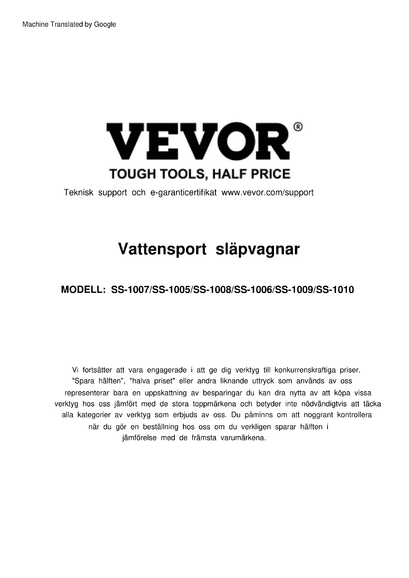 DE HIERBOVEN IN DEZE OVEREENKOMST VERMELDE WAARSCHUWINGEN EN PRAKTIJKEN Technische ondersteuning en e-garantiecertificaat www.vevor.com/support ALLE GEVALLEN VAN RISICO OF GEVAAR. GEBRUIK ALSTUBLIEFT UW GEZOND VERSTAND EN EC-REP VK REP Machine Translated by GoogleVattensport släpvagnar MODELL: SS-1007/SS-1005/SS-1008/SS-1006/SS-1009/SS-1010 Teknisk support och e-garanticertifikat www.vevor.com/support "Spara hälften", "halva priset" eller andra liknande uttryck som används av oss representerar bara en uppskattning av besparingar du kan dra nytta av att köpa vissa verktyg hos oss jämfört med de stora toppmärkena och betyder inte nödvändigtvis att täcka alla kategorier av verktyg som erbjuds av oss. Du påminns om att noggrant kontrollera när du gör en beställning hos oss om du verkligen sparar hälften i jämförelse med de främsta varumärkena. Vi fortsätter att vara engagerade i att ge dig verktyg till konkurrenskraftiga priser. Machine Translated by GoogleDetta är den ursprungliga instruktionen, läs alla instruktioner noggrant innan du använder den. VEVOR reserverar sig för en tydlig tolkning av vår användarmanual. Utseendet på produkten är beroende av den produkt du fått. Ursäkta oss att vi inte kommer att informera dig igen om det finns någon teknik eller mjukvaruuppdateringar på vår produkt. MODELL: SS-1007/SS-1005/SS-1008/SS-1006/SS-1009/SS-1010 Har du produktfrågor? Behöver du teknisk support? Kontakta oss gärna: Teknisk support och e-garanticertifikat www.vevor.com/support DRAGBAR VATTENSPORT BEHÖVER HJÄLP? KONTAKTA OSS!