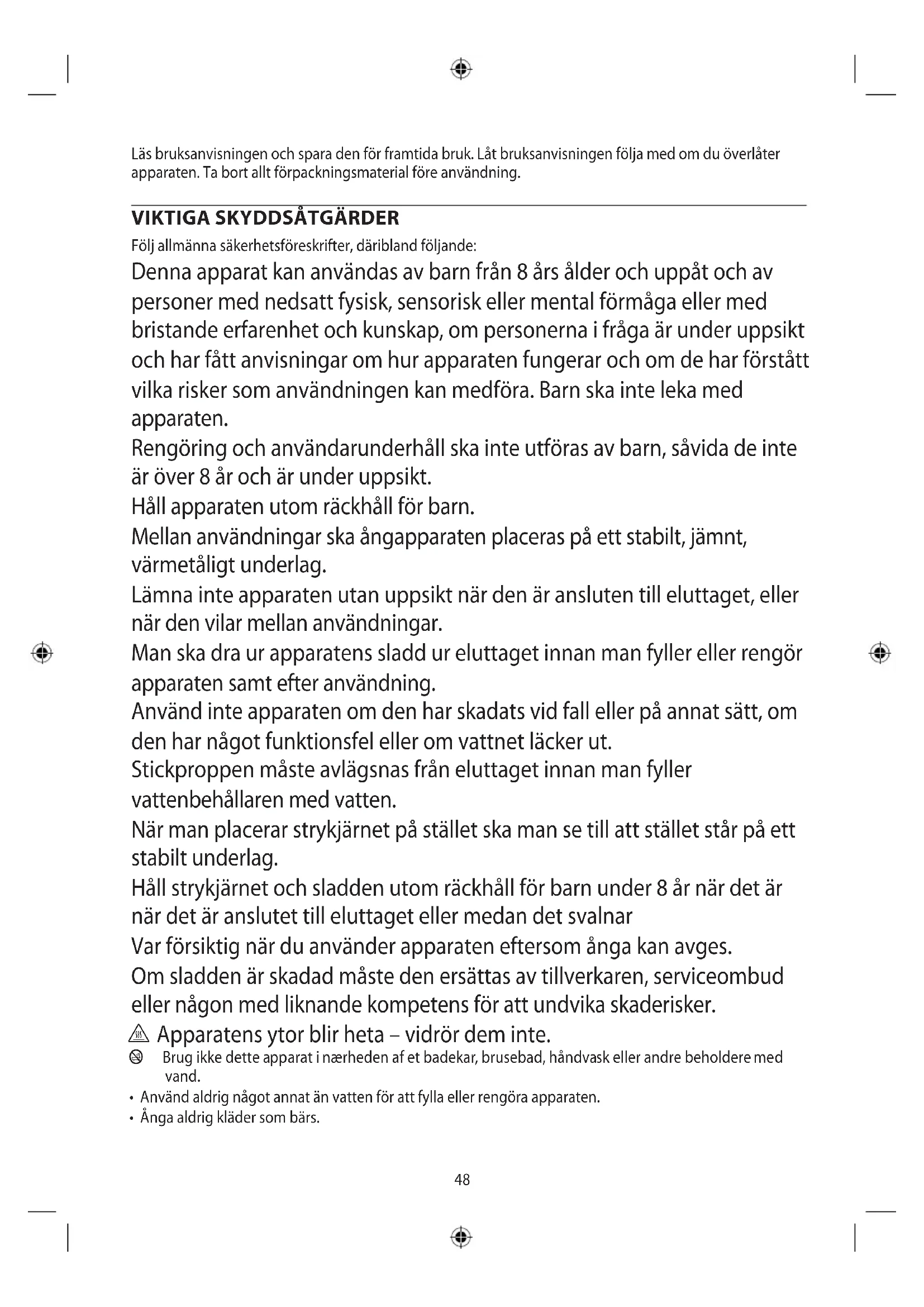 Följ allmänna säkerhetsföreskrifter, däribland följande: Denna apparat kan användas av barn från 8 års ålder och uppåt och av personer med nedsatt fysisk, sensorisk eller mental förmåga eller med bristande erfarenhet och kunskap, om personerna i fråga är under uppsikt och har fått anvisningar om hur apparaten fungerar och om de har förstått vilka risker som användningen kan medföra. Barn ska inte leka med apparaten. Rengöring och användarunderhåll ska inte utföras av barn, såvida de inte är över 8 år och är under uppsikt. Håll apparaten utom räckhåll för barn. Mellan användningar ska ångapparaten placeras på ett stabilt, jämnt, värmetåligt underlag. Lämna inte apparaten utan uppsikt när den är ansluten till eluttaget, eller när den vilar mellan användningar. Man ska dra ur apparatens sladd ur eluttaget innan man fyller eller rengör apparaten samt efter användning. Använd inte apparaten om den har skadats vid fall eller på annat sätt, om den har något funktionsfel eller om vattnet läcker ut. Stickproppen måste avlägsnas från eluttaget innan man fyller vattenbehållaren med vatten. När man placerar strykjärnet på stället ska man se till att stället står på ett stabilt underlag. Håll strykjärnet och sladden utom räckhåll för barn under 8 år när det är när det är anslutet till eluttaget eller medan det svalnar Var försiktig när du använder apparaten eftersom ånga kan avges. Om sladden är skadad måste den ersättas av tillverkaren, serviceombud eller någon med liknande kompetens för att undvika skaderisker.