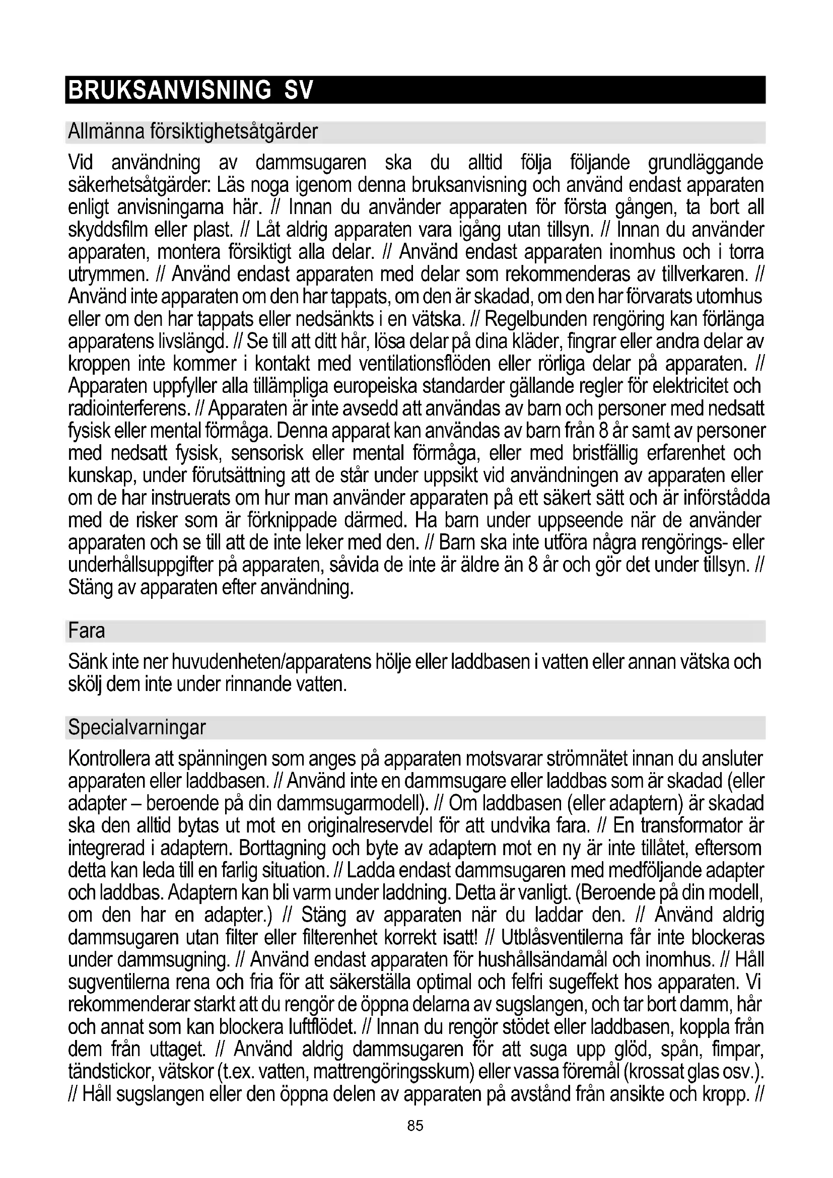 // Sett den rengjorte børstevalsen på plass i munnstykket. Skyv delen med den smale enden inn i åpningen, og plasser delen med "håndtaket" tilbake på plass i selve munnstykket. Børstevalsen er i riktig posisjon når du hører et lite klikk. Før du setter støvbeholderen tilbake på plass, må du kontrollere at alle komponentene er helt tørre. Fuktige deler kan føre til feilfunksjon på støvsugeren. // Sett filterringen inn i beholderen og lås den ved å dreie i motsatt retning av da du løsnet den. Du hører et klikk når filterringen er montert riktig. // Lukk bunnen av beholderen. Du kan også kontrollere om filteret er i riktig posisjon ved å sjekke om nedre del av beholderen er lett å lukke, og at du ikke må bruke makt for å åpne den igjen. // Hvis du bruker makt for å lukke den, kan du ødelegge bunnen av beholderen. // På den øvre delen setter du filteret riktig tilbake på plass i ringen og beholderen. // Hvis pilene på filteret og beholderen flukter, er filteret riktig montert. "Håndtaket" på filteret må også festes trygt i beholderen. Riktig plassering av bakre del av beholderen på motordelen // Fremre del av beholderen, inkludert koblingsdelen for slangen, må settes inn i sporene på motordelen. Bare da kan du skyve bakre del av beholderen inn på låsen på motordelen. // Hvis filteret er satt riktig inn i beholderen og beholderen er låst trygt i sporene, skal det være lett å koble beholderen til motordelen. // Hvis ikke, må du gjenta prosedyren. SKIFTE FILTER For lengst mulig levetid for apparatet,anbefales det å rengjøre filteret regelmessig etter hver bruk og å skifte det ut etter 6 måneder med jevnlig bruk. 84BRUKSANVISNING SV Allmänna försiktighetsåtgärder Vid användning av dammsugaren ska du alltid följa följande grundläggande säkerhetsåtgärder: Läs noga igenom denna bruksanvisning och använd endast apparaten enligt anvisningarna här. // Innan du använder apparaten för första gången, ta bort all skyddsfilm eller plast. // Låt aldrig apparaten vara igång utan tillsyn. // Innan du använder apparaten, montera försiktigt alla delar. // Använd endast apparaten inomhus och i torra utrymmen. // Använd endast apparaten med delar som rekommenderas av tillverkaren. // Använd inte apparaten om den har tappats, om den är skadad, om den har förvarats utomhus eller om den har tappats eller nedsänkts i en vätska. // Regelbunden rengöring kan förlänga apparatens livslängd. // Se till att ditt hår, lösa delar på dina kläder, fingrar eller andra delar av kroppen inte kommer i kontakt med ventilationsflöden eller rörliga delar på apparaten. // Apparaten uppfyller alla tillämpliga europeiska standarder gällande regler för elektricitet och radiointerferens. // Apparaten är inte avsedd att användas av barn och personer med nedsatt fysisk eller mental förmåga. Denna apparat kan användas av barn från 8 år samt av personer med nedsatt fysisk, sensorisk eller mental förmåga, eller med bristfällig erfarenhet och kunskap, under förutsättning att de står under uppsikt vid användningen av apparaten eller om de har instruerats om hur man använder apparaten på ett säkert sätt och är införstådda med de risker som är förknippade därmed. Ha barn under uppseende när de använder apparaten och se till att de inte leker med den. // Barn ska inte utföra några rengörings- eller underhållsuppgifter på apparaten, såvida de inte är äldre än 8 år och gör det under tillsyn. // Stäng av apparaten efter användning. Fara Sänk inte ner huvudenheten/apparatens hölje eller laddbasen i vatten eller annan vätska och skölj dem inte under rinnande vatten. Specialvarningar Kontrollera att spänningen som anges på apparaten motsvarar strömnätet innan du ansluter apparaten eller laddbasen. // Använd inte en dammsugare eller laddbas som är skadad (eller adapter – beroende på din dammsugarmodell). // Om laddbasen (eller adaptern) är skadad ska den alltid bytas ut mot en originalreservdel för att undvika fara. // En transformator är integrerad i adaptern. Borttagning och byte av adaptern mot en ny är inte tillåtet, eftersom detta kan leda till en farlig situation. // Ladda endast dammsugaren med medföljande adapter och laddbas. Adaptern kan bli varm under laddning. Detta är vanligt. (Beroende på din modell, om den har en adapter.) // Stäng av apparaten när du laddar den. // Använd aldrig dammsugaren utan filter eller filterenhet korrekt isatt! // Utblåsventilerna får inte blockeras under dammsugning. // Använd endast apparaten för hushållsändamål och inomhus. // Håll sugventilerna rena och fria för att säkerställa optimal och felfri sugeffekt hos apparaten. Vi rekommenderar starkt att du rengör de öppna delarna av sugslangen, och tar bort damm, hår och annat som kan blockera luftflödet. // Innan du rengör stödet eller laddbasen, koppla från dem från uttaget. // Använd aldrig dammsugaren för att suga upp glöd, spån, fimpar, tändstickor, vätskor (t.ex. vatten, mattrengöringsskum) eller vassa föremål (krossat glas osv.). // Håll sugslangen eller den öppna delen av apparaten på avstånd från ansikte och kropp. // 85Använd aldrig apparaten för att dammsuga byggmaterial (t.ex. fin sand, kalk, cementpulver, färgdamm etc.). Detta kan orsaka skador på apparaten.) Problem och lösning Problem Möjlig anledning Lösning Fungerar inte. Batteriet är slut. Handdammsugaren är inte monterad rätt. Ladda: Montera handdammsugaren rätt. Sugkraften har minskat. Dammkoppen är full. Blockering i filtret. Blockering i luftinloppstunneln eller på elborstens rulle. Häll ut dammet. Rengör eller byt ut filtret. Rengör elborsten