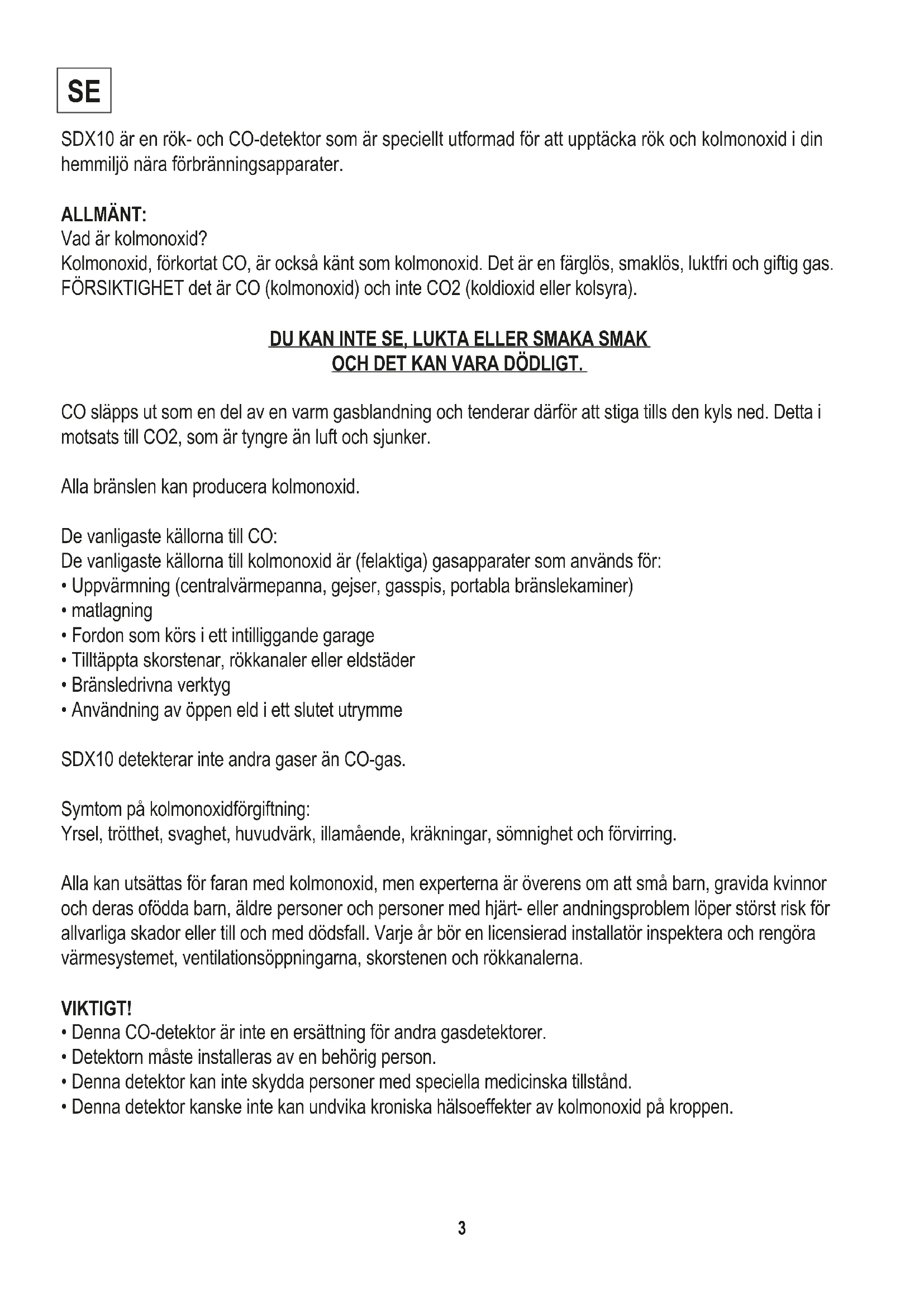 - Användning av öppen eld i ett slutet utrymme SDX10 detekterar inte andra gaser än CO-gas. Symtom på kolmonoxidförgiftning: Yrsel, trötthet, svaghet, huvudvärk, illamående, kräkningar, sömnighet och förvirring. Alla kan utsättas för faran med kolmonoxid, men experterna är överens om att små barn, gravida kvinnor och deras ofödda barn, äldre personer och personer med hjärt- eller andningsproblem löper störst risk för allvarliga skador eller till och med dödsfall. Varje år bör en licensierad installatör inspektera och rengöra värmesystemet, ventilationsöppningarna, skorstenen och rökkanalerna. VIKTIGT!