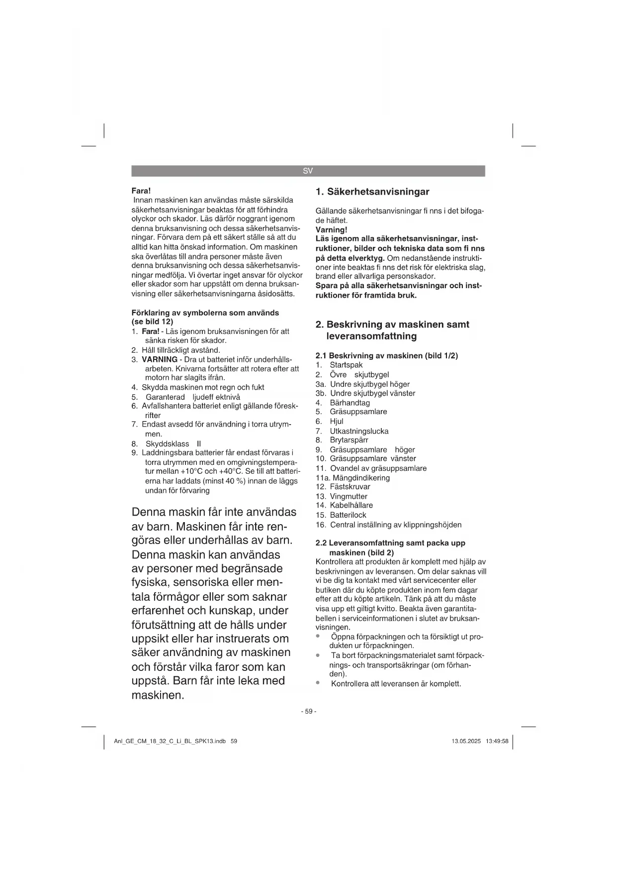 torra utrymmen med en omgivningstempera- tur mellan +10°C och +40°C. Se till att batteri- erna har laddats (minst 40 %) innan de läggs undan för förvaring Denna maskin får inte användas av barn. Maskinen får inte ren- göras eller underhållas av barn. Denna maskin kan användas av personer med begränsade fysiska, sensoriska eller men- tala förmågor eller som saknar erfarenhet och kunskap, under förutsättning att de hålls under uppsikt eller har instruerats om säker användning av maskinen och förstår vilka faror som kan uppstå. Barn får inte leka med maskinen.