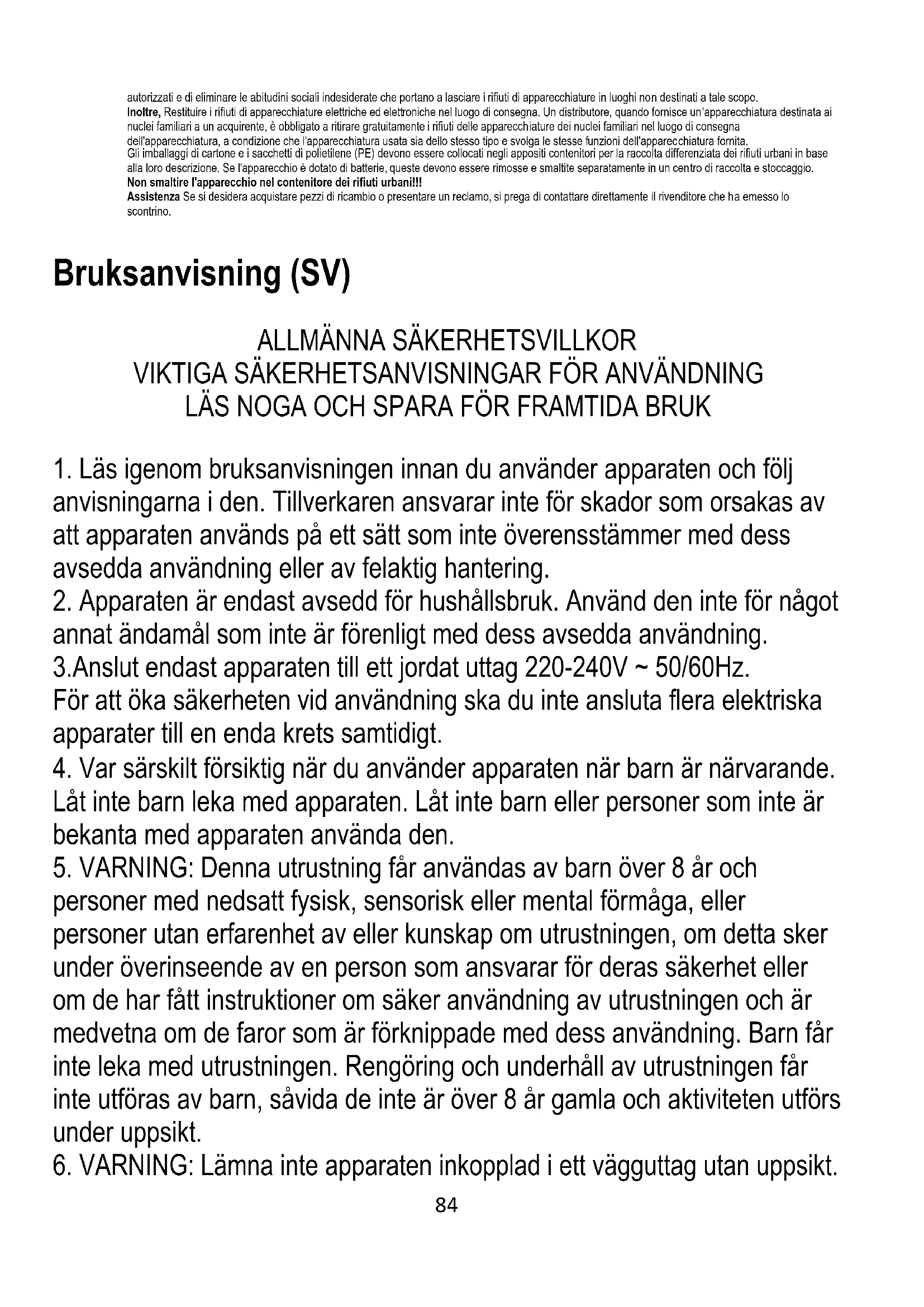 personer med nedsatt fysisk, sensorisk eller mental förmåga, eller personer utan erfarenhet av eller kunskap om utrustningen, om detta sker under överinseende av en person som ansvarar för deras säkerhet eller om de har fått instruktioner om säker användning av utrustningen och är medvetna om de faror som är förknippade med dess användning. Barn får inte leka med utrustningen. Rengöring och underhåll av utrustningen får inte utföras av barn, såvida de inte är över 8 år gamla och aktiviteten utförs under uppsikt.