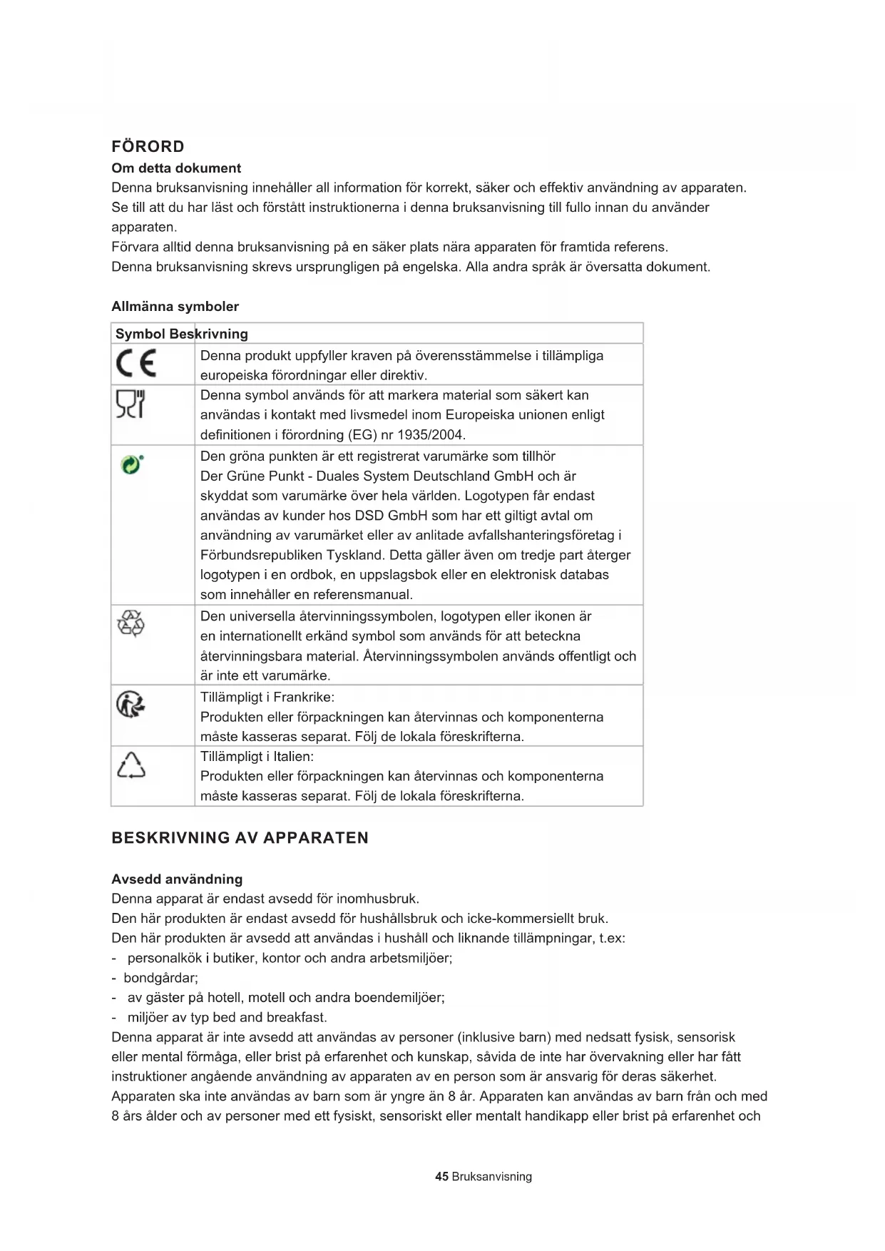 Bruksanvisning Digital luftfritös 8 L45 Bruksanvisning FÖRORD Om detta dokument Denna bruksanvisning innehåller all information för korrekt, säker och effektiv användning av apparaten. Se till att du har läst och förstått instruktionerna i denna bruksanvisning till fullo innan du använder apparaten. Förvara alltid denna bruksanvisning på en säker plats nära apparaten för framtida referens. Denna bruksanvisning skrevs ursprungligen på engelska. Alla andra språk är översatta dokument. Allmänna symboler Symbol Beskrivning Denna produkt uppfyller kraven på överensstämmelse i tillämpliga europeiska förordningar eller direktiv. Denna symbol används för att markera material som säkert kan användas i kontakt med livsmedel inom Europeiska unionen enligt denitionen i förordning (EG) nr 1935/2004. Den gröna punkten är ett registrerat varumärke som tillhör Der Grüne Punkt - Duales System Deutschland GmbH och är skyddat som varumärke över hela världen. Logotypen får endast användas av kunder hos DSD GmbH som har ett giltigt avtal om användning av varumärket eller av anlitade avfallshanteringsföretag i Förbundsrepubliken Tyskland. Detta gäller även om tredje part återger logotypen i en ordbok, en uppslagsbok eller en elektronisk databas som innehåller en referensmanual. Den universella återvinningssymbolen, logotypen eller ikonen är en internationellt erkänd symbol som används för att beteckna återvinningsbara material. Återvinningssymbolen används oentligt och är inte ett varumärke. Tillämpligt i Frankrike: Produkten eller förpackningen kan återvinnas och komponenterna måste kasseras separat. Följ de lokala föreskrifterna. Tillämpligt i Italien: Produkten eller förpackningen kan återvinnas och komponenterna måste kasseras separat. Följ de lokala föreskrifterna.
