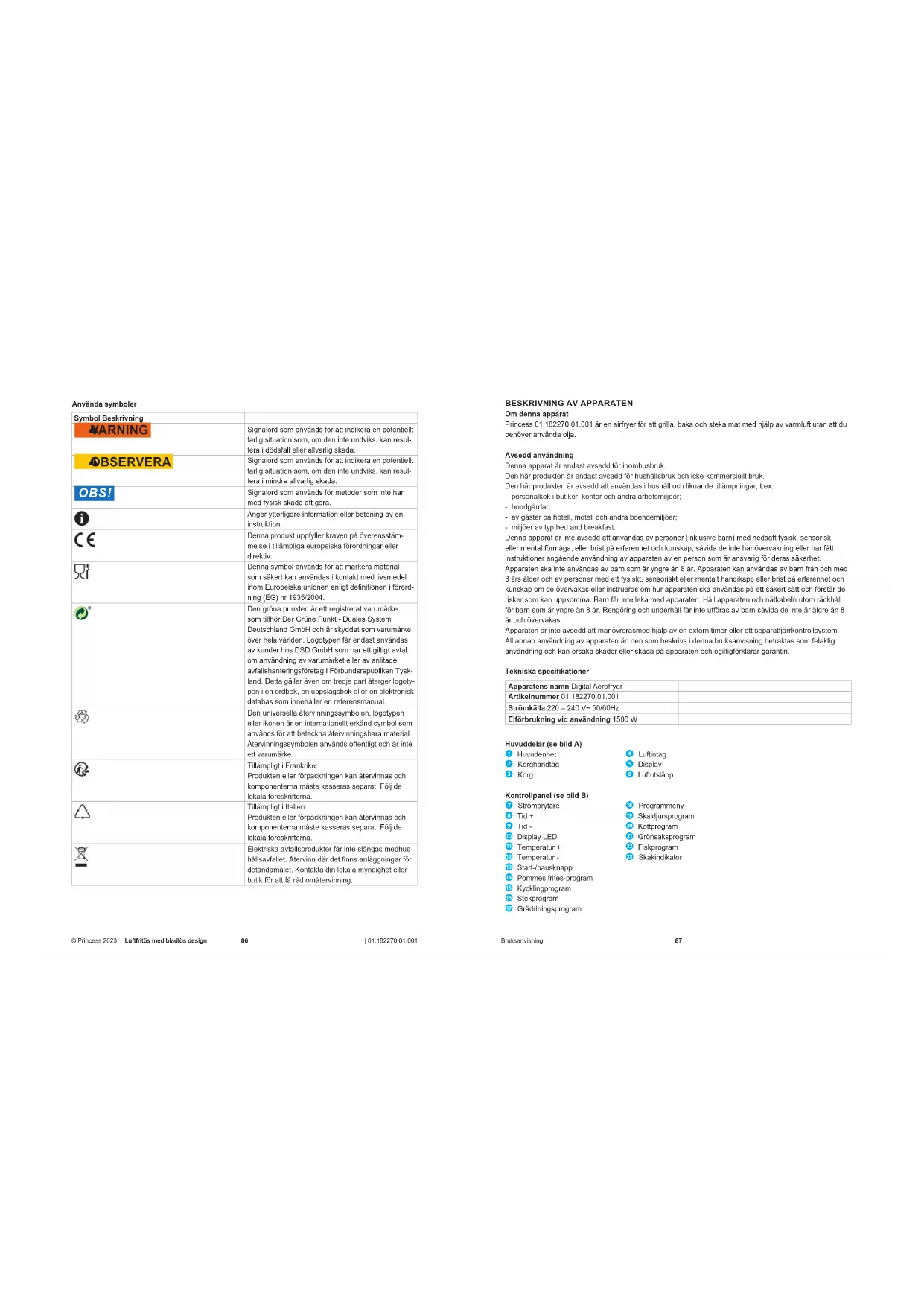 Om denna apparat Princess 01.182270.01.001 är en airfryer för att grilla, baka och steka mat med hjälp av varmluft utan att du behöver använda olja. Avsedd användning Denna apparat är endast avsedd för inomhusbruk. Den här produkten är endast avsedd för hushållsbruk och icke-kommersiellt bruk. Den här produkten är avsedd att användas i hushåll och liknande tillämpningar, t.ex: - personalkök i butiker, kontor och andra arbetsmiljöer; - bondgårdar; - av gäster på hotell, motell och andra boendemiljöer; - miljöer av typ bed and breakfast. Denna apparat är inte avsedd att användas av personer (inklusive barn) med nedsatt fysisk, sensorisk eller mental förmåga, eller brist på erfarenhet och kunskap, såvida de inte har övervakning eller har fått instruktioner angående användning av apparaten av en person som är ansvarig för deras säkerhet. Apparaten ska inte användas av barn som är yngre än 8 år. Apparaten kan användas av barn från och med 8 års ålder och av personer med ett fysiskt, sensoriskt eller mentalt handikapp eller brist på erfarenhet och kunskap om de övervakas eller instrueras om hur apparaten ska användas på ett säkert sätt och förstår de risker som kan uppkomma. Barn får inte leka med apparaten. Håll apparaten och nätkabeln utom räckhåll för barn som är yngre än 8 år. Rengöring och underhåll får inte utföras av barn såvida de inte är äldre än 8 år och övervakas. Apparaten är inte avsedd att manövrerasmed hjälp av en extern timer eller ett separatfjärrkontrollsystem. All annan användning av apparaten än den som beskrivs i denna bruksanvisning betraktas som felaktig användning och kan orsaka skador eller skada på apparaten och ogiltigförklarar garantin. Tekniska specikationer Apparatens namn Digital Aerofryer Artikelnummer 01.182270.01.001 Strömkälla 220 – 240 V~ 50/60Hz Elförbrukning vid användning 1500 W Huvuddelar (se bild A)