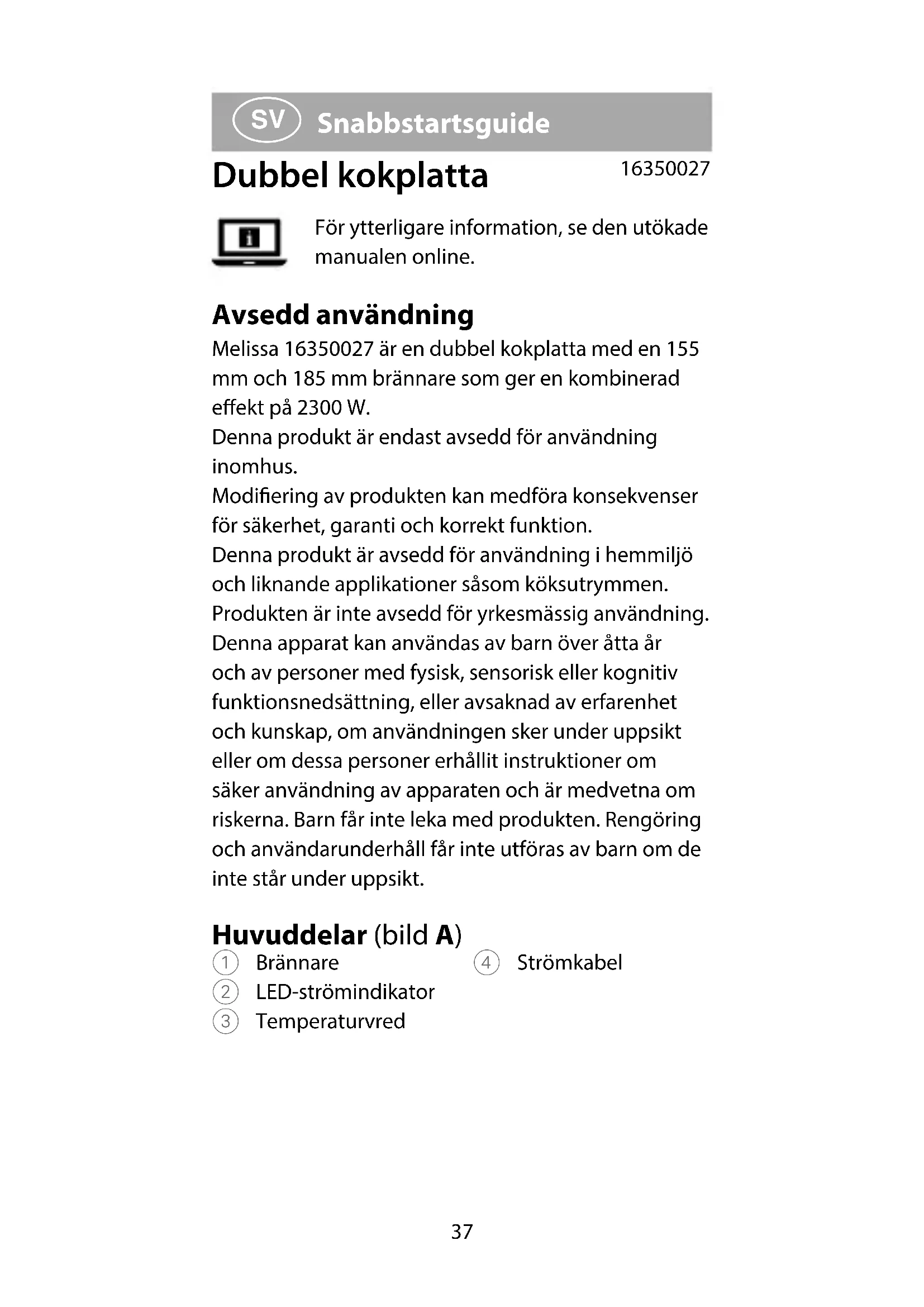 För ytterligare information, se den utökade manualen online. Avsedd användning Melissa 16350027 är en dubbel kokplatta med en 155 mm och 185 mm brännare som ger en kombinerad eekt på 2300 W. Denna produkt är endast avsedd för användning inomhus. Modiering av produkten kan medföra konsekvenser för säkerhet, garanti och korrekt funktion. Denna produkt är avsedd för användning i hemmiljö och liknande applikationer såsom köksutrymmen. Produkten är inte avsedd för yrkesmässig användning. Denna apparat kan användas av barn över åtta år och av personer med fysisk, sensorisk eller kognitiv funktionsnedsättning, eller avsaknad av erfarenhet och kunskap, om användningen sker under uppsikt eller om dessa personer erhållit instruktioner om säker användning av apparaten och är medvetna om riskerna. Barn får inte leka med produkten. Rengöring och användarunderhåll får inte utföras av barn om de inte står under uppsikt. Huvuddelar (bild A) 1 Brännare 2 LED-strömindikator 3 Temperaturvred 4 Strömkabel38 Säkerhetsanvisningar Symbol Beskrivning Indikering för en het yta. Kontakt kan förorsaka brännskador. Vidrör ej.