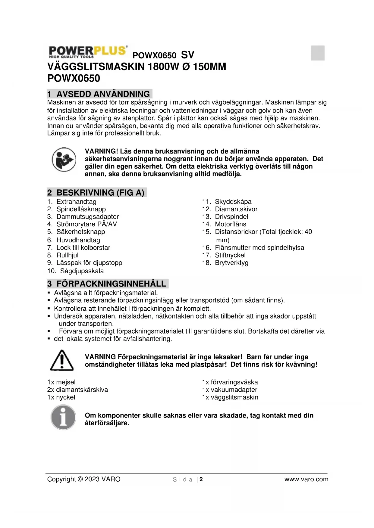 - det lokala systemet för avfallshantering. VARNING Förpackningsmaterial är inga leksaker! Barn får under inga omständigheter tillåtas leka med plastpåsar! Det finns risk för kvävning! 1x mejsel 2x diamantskärskiva 1x nyckel 1x förvaringsväska 1x vakuumadapter 1x väggslitsmaskin Om komponenter skulle saknas eller vara skadade, tag kontakt med din återförsäljare.POWX0650 SV Copyright © 2023 VARO S i d a | 3 www.varo.com 4 SYMBOLER Följande symboler används i bruksanvisningen och/eller på maskinen: