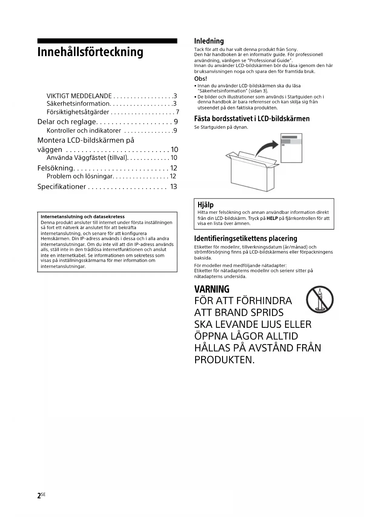 - Innan du använder LCD-bildskärmen ska du läsa “Säkerhetsinformation” (sidan 3).• De bilder och illustrationer som används i Startguiden och i denn a handbok är bara referenser och kan skilja sig från utseendet på den faktiska produkten. Fästa bordsstativet i LCD-bildskärmen Se Startguiden på dynan. Identifieringsetikettens placering Etiketter för modellnr, tillverkningsdatum (år/månad) och strömförsörjning finns på LCD-bildskärmens eller förpackningens baksida.För modeller med medföljande nätadapter:Etiketter för nätadapterns modellnr och serienr sitter på tadapterns undersida. VARNING