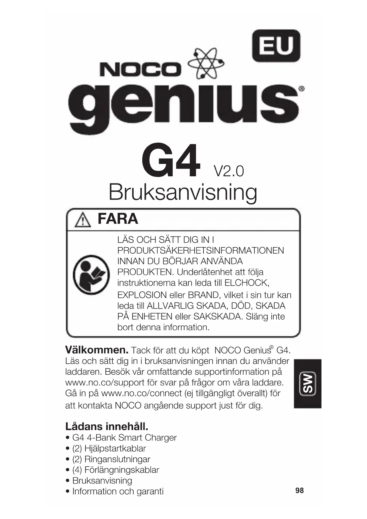 - G4 4-Bank Smart Charger• (2) Hjälpstartkablar• (2) Ringanslutningar• (4) Förlängningskablar• Bruksanvisning• Information och garanti Bruksanvisning G4 V2.0 LÄS OCH SÄTT DIG IN I PRODUKTSÄKERHETSINFORMATIONEN INNAN DU BÖRJAR ANVÄNDA PRODUKTEN. Underlåtenhet att följa instruktionerna kan leda till ELCHOCK, EXPLOSION eller BRAND, vilket i sin tur kan leda till ALLVARLIG SKADA, DÖD, SKADA PÅ ENHETEN eller SAKSKADA. Släng inte bort denna information. FARAKontakta NOCO. Om G4. NOCO Genius