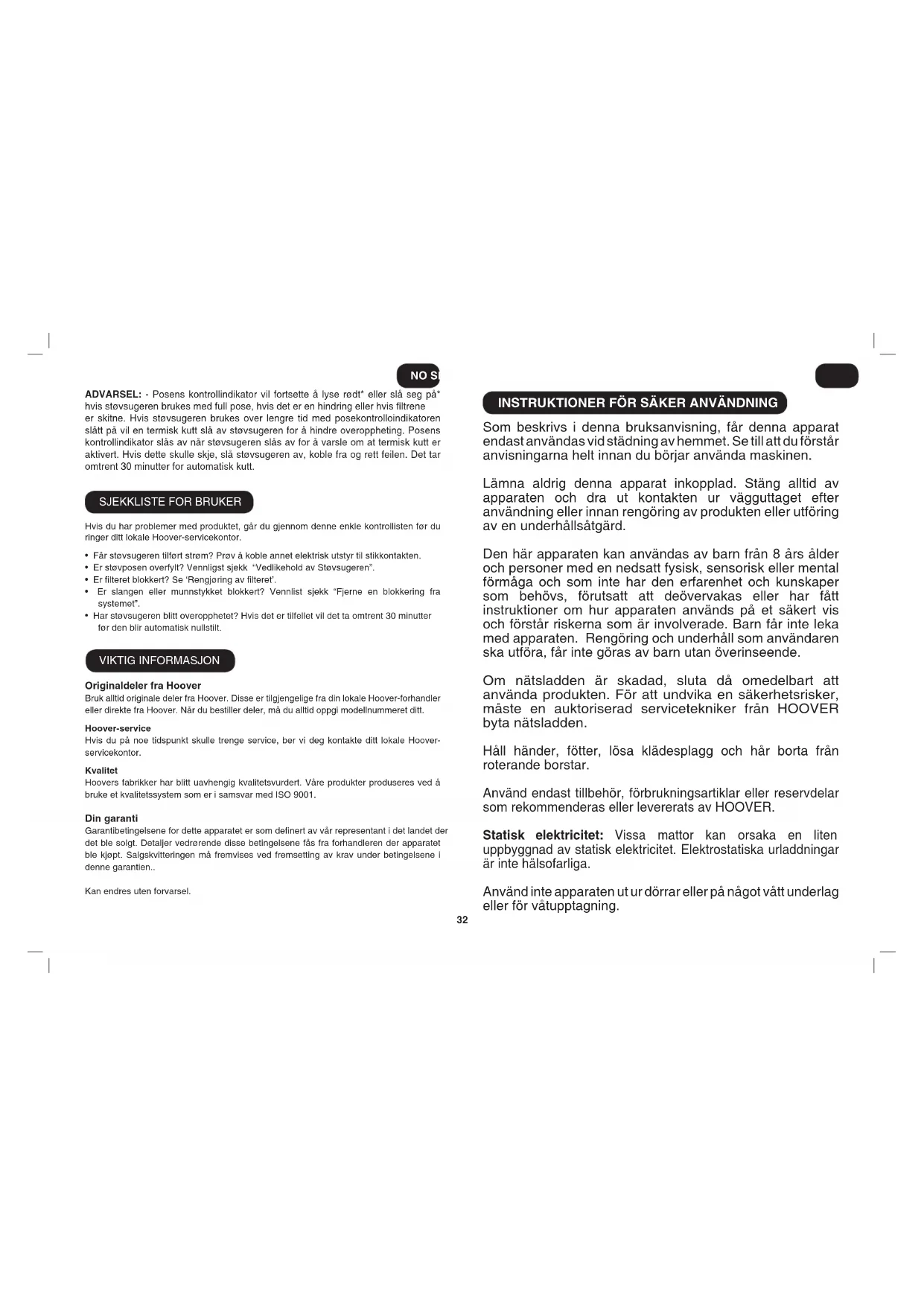 - Är dammsugaren överhettad? Om så är fallet tar det cirka 30 minuter för en automatisk återställning. VIKTIG INFORMATION Reserv-ochförbrukningsdelarfrånHoover Använd alltid originaldelar från Hoover vid byte. Du kan beställa delar från närmaste Hoover-återförsäljare eller direkt från Hoover. Uppge alltid modellnummer när du beställer delar. Hoover-service Kontakta ditt närmaste Hoover-servicekontor om du behöver service. Kvalitet Hoovers fabriker har kvalitetsbedömts av oberoende organisationer. Våra produkter tillverkas enligt ett kvalitetssystem som uppfyller kraven för ISO 9001. Garanti Garantivillkoren för produkten denieras av vår representant i det land där produkten säljs. Du kan få uppgifter om aktuella villkor från återförsäljaren. Kvittot måste visas upp när man kräver ersättning enligt garantin. Specikationerna kan ändras utan föregående meddelande.36