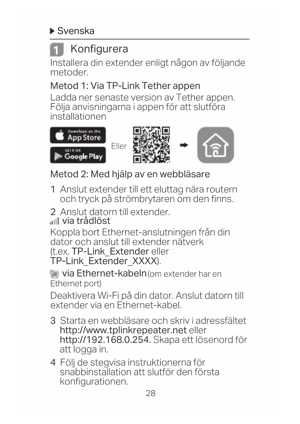 Konfigurera Installera din extender enligt någon av följande metoder. Metod 1: Via TP-Link Tether appen Ladda ner senaste version av Tether appen. Följa anvisningarna i appen för att slutföra installationen Metod 2: Med hjälp av en webbläsare 1 Anslut extender till ett eluttag nära routern och tryck på strömbrytaren om den finns. 2 Anslut datorn till extender. via trådlöst Koppla bort Ethernet-anslutningen från din dator och anslut till extender nätverk (t.ex. TP-Link_Extender eller TP-Link_Extender_XXXX). via Ethernet-kabeln (om extender har en Ethernet port) Deaktivera Wi-Fi på din dator. Anslut datorn till extender via en Ethernet-kabel. 3 Starta en webbläsare och skriv i adressfältet http://www.tplinkrepeater.net eller http://192.168.0.254. Skapa ett lösenord för att logga in. 4 Följ de stegvisa instruktionerna för snabbinstallation att slutför den första konfigurationen. EllerSvenska