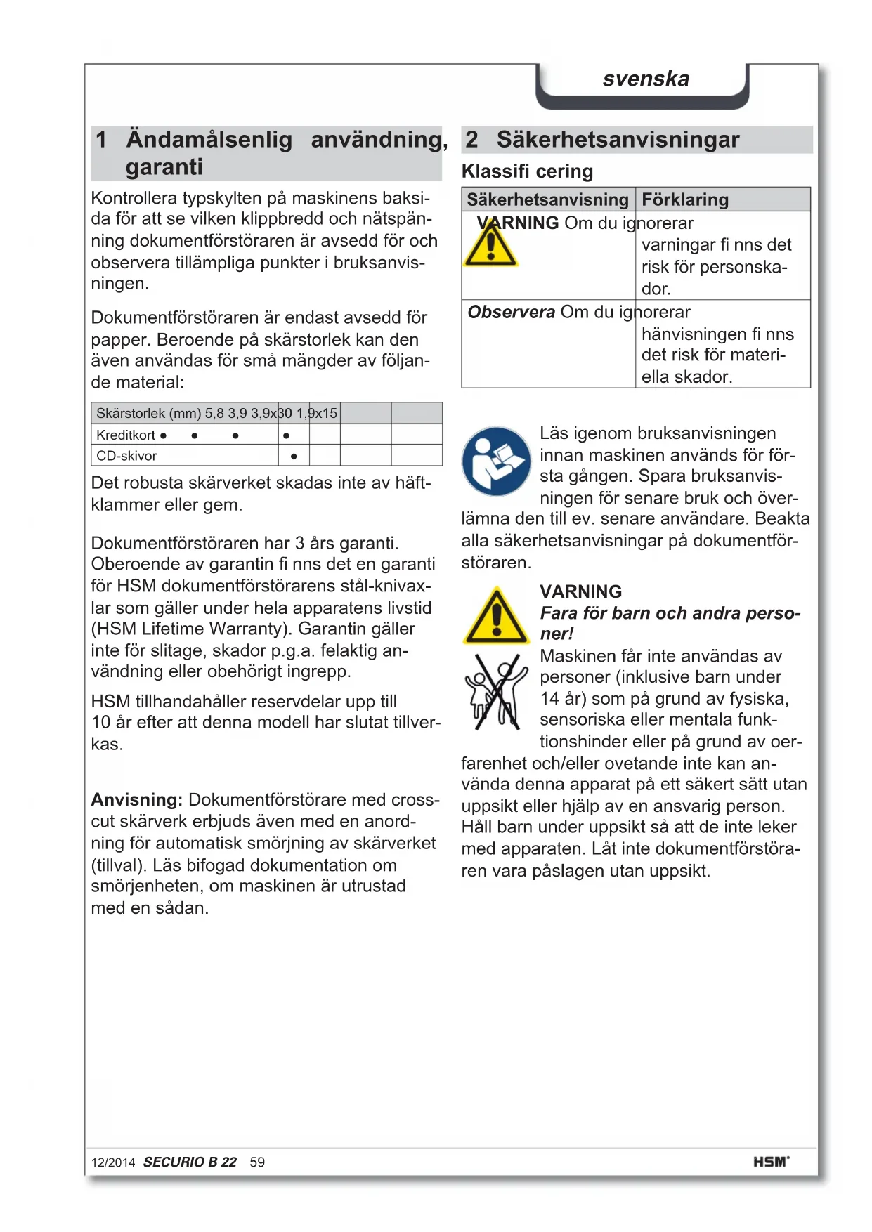 - RoHS-direk v 2011/65/EU EU-overensstemmlseserklæringen kan bes lles hos producenten.12/2014 SECURIO B 22 59 svenska 2 Säkerhetsanvisningar Klassifi cering Säkerhetsanvisning Förklaring VARNING Om du ignorerar varningar fi nns det risk för personska- dor. Observera Om du ignorerar hänvisningen fi nns det risk för materi- ella skador. Läs igenom bruksanvisningen innan maskinen används för för- sta gången. Spara bruksanvis- ningen för senare bruk och över- lämna den till ev. senare användare. Beakta alla säkerhetsanvisningar på dokumentför- störaren. VARNING Fara för barn och andra perso- ner! Maskinen får inte användas av personer (inklusive barn under 14 år) som på grund av fysiska, sensoriska eller mentala funk- tionshinder eller på grund av oer- farenhet och/eller ovetande inte kan an- vända denna apparat på ett säkert sätt utan uppsikt eller hjälp av en ansvarig person. Håll barn under uppsikt så att de inte leker med apparaten. Låt inte dokumentförstöra- ren vara påslagen utan uppsikt. 1 Ändamålsenlig användning, garanti Kontrollera typskylten på maskinens baksi- da för att se vilken klippbredd och nätspän- ning dokumentförstöraren är avsedd för och observera tillämpliga punkter i bruksanvis- ningen. Dokumentförstöraren är endast avsedd för papper. Beroende på skärstorlek kan den även användas för små mängder av följan- de material: Skärstorlek (mm) 5,8 3,9 3,9x30 1,9x15 Kreditkort ●● ● ● CD-skivor ● Det robusta skärverket skadas inte av häft- klammer eller gem. Anvisning: Dokumentförstörare med cross- cut skärverk erbjuds även med en anord- ning för automatisk smörjning av skärverket (tillval). Läs bifogad dokumentation om smörjenheten, om maskinen är utrustad med en sådan. Dokumentförstöraren har 3 års garanti. Oberoende av garantin fi nns det en garanti för HSM dokumentförstörarens stål-knivax- lar som gäller under hela apparatens livstid (HSM Lifetime Warranty). Garantin gäller inte för slitage, skador p.g.a. felaktig an- vändning eller obehörigt ingrepp. HSM tillhandahåller reservdelar upp till 10 år efter att denna modell har slutat tillver- kas.60 SECURIO B 22 12/2014 svenska VARNING Farlig nätspänning! Felaktig användning av maskinen kan ge elektriska stötar. – Kontrollera att strömnätets spänningoch frekvens stämmer överens med uppgif- terna på typskylten innan nätkontakten ansluts. – Se till att nätkontakten är lätt åtkomlig. – Se till att det inte kommer in vatten i do- kumentförstöraren, stoppa inte ner nätka- beln eller nätkontakten i vatten. – Ta inte i nätkontakten med våta händer. – Dra aldrig ut kontakten ur uttaget i slad- den, fatta alltid tag i kontakten. – Använd endast apparaten inomhus i torra rum. Slå aldrig på den i fuktiga rum eller i regn. Kontrollera apparaten och kabeln regelbundet så att de inte är ska- dade. Om dokumentförstöraren uppvisar skador eller inte fungerar riktigt resp. om den ska fl yttas eller ren- göras: stäng av den och dra ut nätkontak- ten. – Låt inte apparaten, nätkontakten och nät- kabeln komma nära öppen eld och heta ytor. Luftspringorna får inte täckas över, dokumentförstörarens avstånd till väggen eller till möbler måste vara minst 5 cm. Servicearbeten som innefattar att huskåpor avlägsnas får endast utföras av HSM:s kundservice och av servicetekniker från våra part- ners. Kundtjänstadresser, se sidan 160. Observera Fara vid felaktig användning Använd endast apparaten till avsedd an- vändning enligt uppgifterna i kapitlet ”Ända- målsenlig användning”. VARNING Risk för skador! Stick aldrig in handen i inmat- ningsöppningen för papper. Risk för skador – indragning! Var försiktigt med långt hår, vida klädesplagg, slipsar, halsdukar, hals- och armband etc. – risk för indragning i inmatningsöppningen. Mata inte in något material som kan bilda slingor, t.ex. band, snö- ren, mjuk plastfolie. Risk för skador – splitter! Använd skyddsglasögon när CDskivor och kreditkort skall förstöras.12/2014 SECURIO B 22 61 svenska 3 Översikt Manöver- och displayelement ReverseringsknappSymboler:Behållare fullSkärverket blockeratBehållare öppenDriftklarManöverknapp 4 Leveransomfång Tillbehör