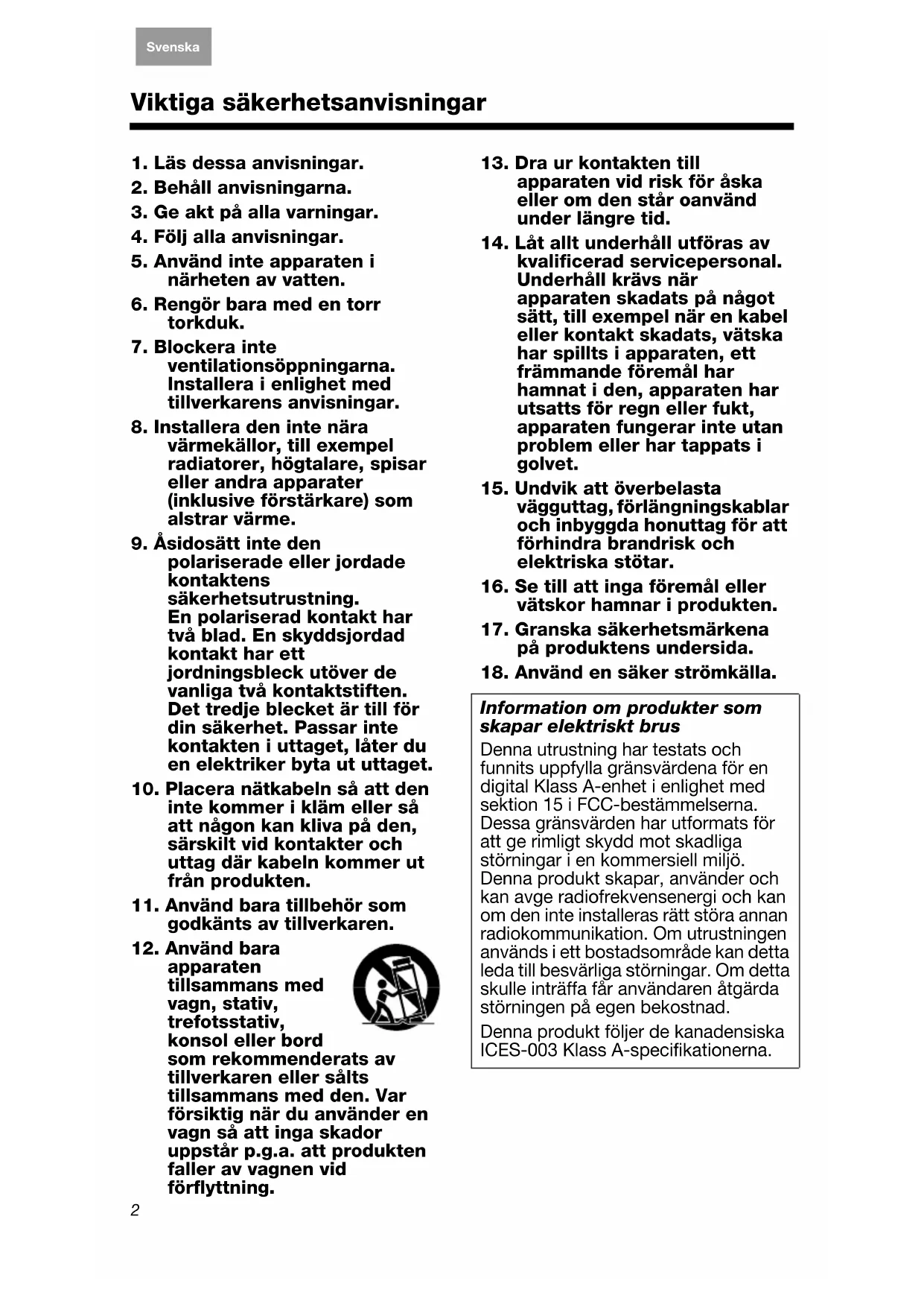 kvalificerad servicepersonal. Underhåll krävs när apparaten skadats på något sätt, till exempel när en kabel eller kontakt skadats, vätska har spillts i apparaten, ett främmande föremål har hamnat i den, apparaten har utsatts för regn eller fukt, apparaten fungerar inte utan problem eller har tappats i golvet.