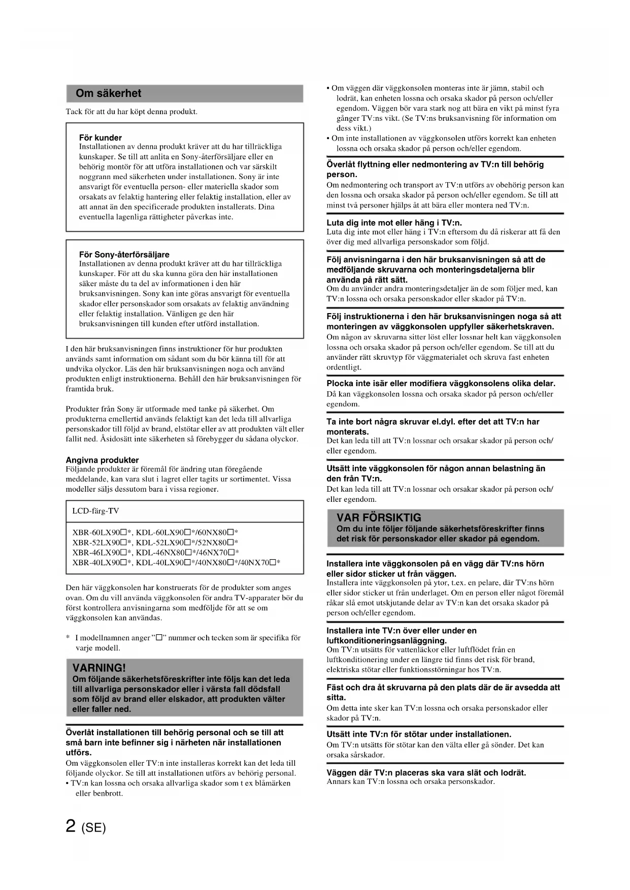 - Nei nomi effettivi dei modelli, “s” indica numeri e/o caratteri utilizzati per designare i singoli modelli di una serie. Altre informazioni C2 (SE) Tack för att du har köpt denna produkt. I den här bruksanvisningen finns instruktioner för hur produkten används samt information om sådant som du bör känna till för att undvika olyckor. Läs den här bruksanvisningen noga och använd produkten enligt instruktionerna. Behåll den här bruksanvisningen för framtida bruk. Produkter från Sony är utformade med tanke på säkerhet. Om produkterna emellertid används felaktigt kan det leda till allvarliga personskador till följd av brand, elstötar eller av att produkten vält eller fallit ned. Åsidosätt inte säkerheten så förebygger du sådana olyckor. Angivna produkter Följande produkter är föremål för ändring utan föregående meddelande, kan vara slut i lagret eller tagits ur sortimentet. Vissa modeller säljs dessutom bara i vissa regioner. Den här väggkonsolen har konstruerats för de produkter som anges ovan. Om du vill använda väggkonsolen för andra TV-apparater bör du först kontrollera anvisningarna som medföljde för att se om väggkonsolen kan användas.