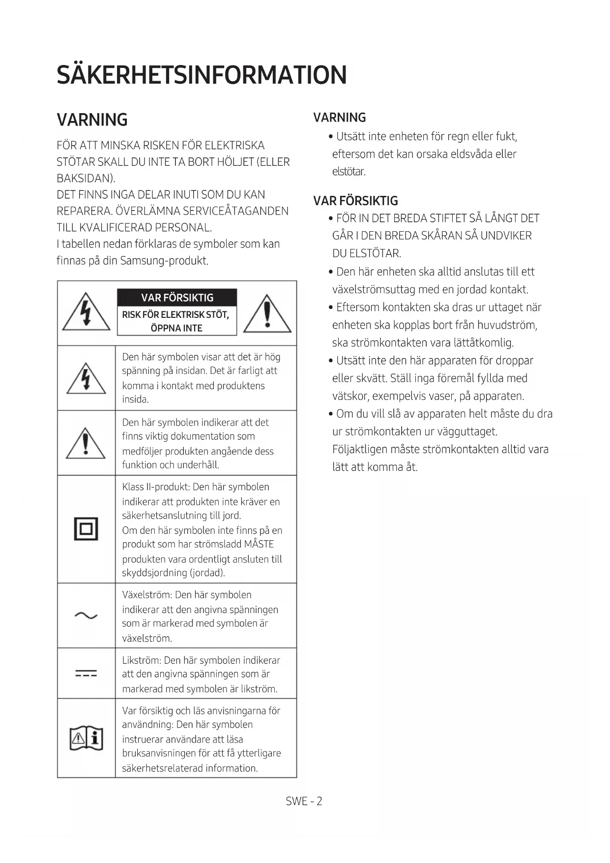 RISK FÖR ELEKTRISK STÖT, ÖPPNA INTEDen här symbolen visar att det är hög spänning på insidan. Det är farligt att komma i kontakt med produktens insida.Den här symbolen indikerar att det nns viktig dokumentation som medföljer produkten angående dess funktion och underhåll.Klass II-produkt: Den här symbolen indikerar att produkten inte kräver en säkerhetsanslutning till jord.Om den här symbolen inte nns på en produkt som har strömsladd MÅSTE produkten vara ordentligt ansluten till skyddsjordning (jordad). Växelström: Den här symbolen indikerar att den angivna spänningen som är markerad med symbolen är växelström.Likström: Den här symbolen indikerar att den angivna spänningen som är markerad med symbolen är likström.Var försiktig och läs anvisningarna för användning: Den här symbolen instruerar användare att läsa bruksanvisningen för att få ytterligare säkerhetsrelaterad information. VARNING