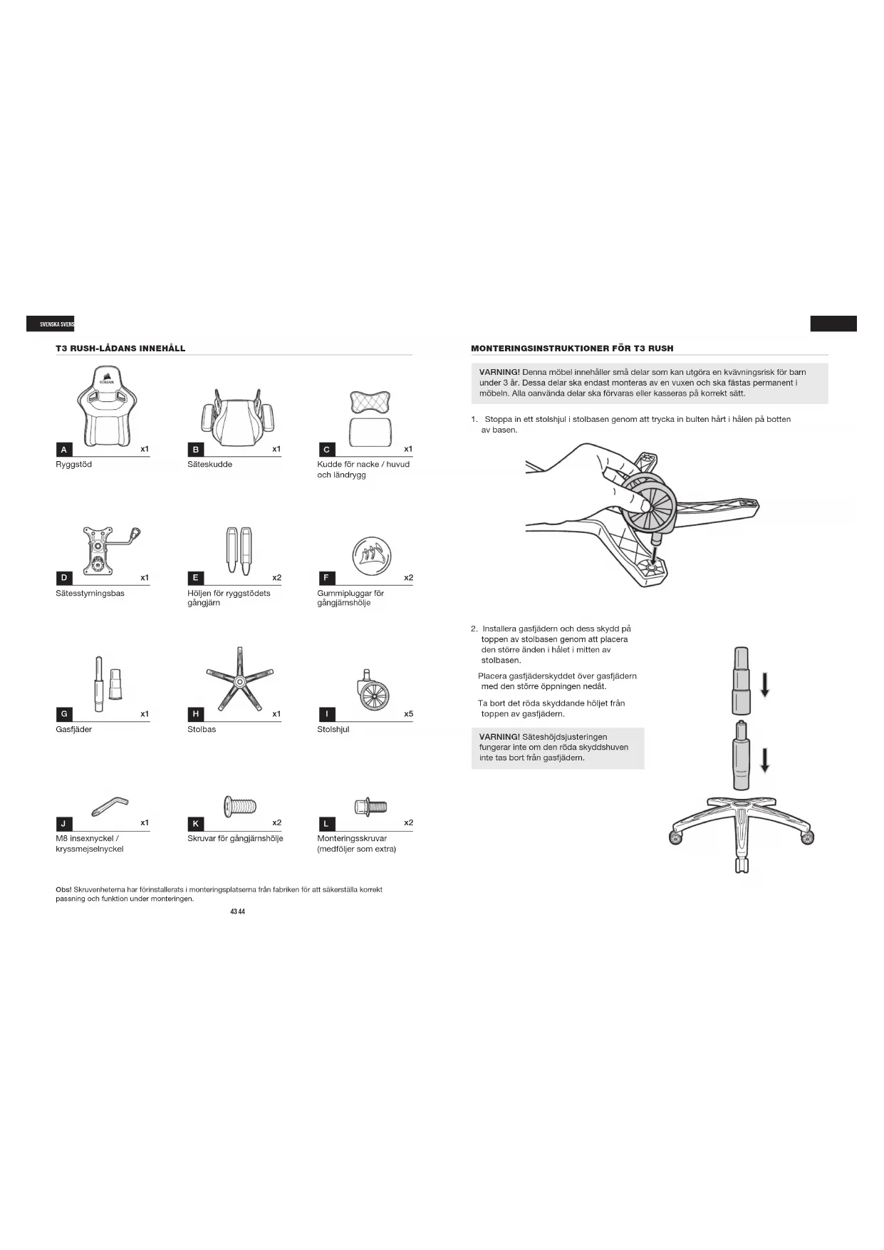 Ryggstöd Gasfjäder Sätesstyrningsbas M8 insexnyckel / kryssmejselnyckel Säteskudde Stolbas Höljen för ryggstödets gångjärn Skruvar för gångjärnshölje Kudde för nacke / huvud och ländrygg Stolshjul Gummipluggar för gångjärnshölje Monteringsskruvar (medföljer som extra) VARNING! Denna möbel innehåller små delar som kan utgöra en kvävningsrisk för barn under 3 år. Dessa delar ska endast monteras av en vuxen och ska fästas permanent i möbeln. Alla oanvända delar ska förvaras eller kasseras på korrekt sätt. VARNING! Säteshöjdsjusteringen fungerar inte om den röda skyddshuven inte tas bort från gasfjädern.