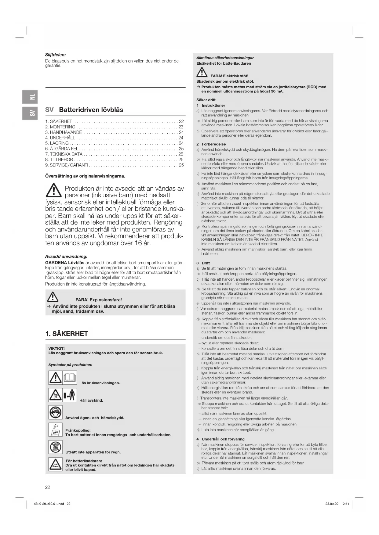 Översättning av originalanvisningarna. Produkten är inte avsedd att an vändas av personer (inklusive barn) med nedsatt fysisk, sensorisk eller intellektuell förmåga eller bris tande erfarenhet och / eller bristande kunska- per. Barn skall hållas under uppsikt för att säker- ställa att de inte leker med produkten. Rengöring och användarunderhåll får inte genomföras av barn utan uppsikt. Vi rekommenderar att produk- ten används av ungdomar över 16 år. Avsedd användning: GARDENA Lövblås är avsedd för att blåsa bort smutspartiklar eller gräs- klipp från gångvägar, infarter, innergårdar osv., för att blåsa samman gräsklipp, strån eller blad till högar eller för att ta bort smutspartiklar från hörn, fogar eller luckor mellan tegel eller murstenar. Produkten är inte konstruerad för långtidsanvändning. FARA! Explosionsfara! v Använd inte produkten i slutna utrymmen eller för att blåsa mjöl, sand, trädamm osv. Allmänna säkerhetsanvisningar Elsäkerhet för batteriladdaren FARA! Elektrisk stöt! Skaderisk genom elektrisk stöt. v Produkten måste matas med ström via en jordfelsbrytare (RCD) med en nominell utlösningsström på högst 30 mA. Säker drift 1 Instruktioner a) Läs noggrant igenom anvisningarna. Var förtrodd med styranordningarna och rätt användning av maskinen. b) Låt aldrig personer eller barn som inte är förtrodda med de här anvisningarna använda maskinen. Lokala bestämmelser kan begränsa operatörens ålder. c) Observera att operatören eller användaren ansvarar för olyckor eller faror gäl- lande andra personer eller deras egendom. 2 Förberedelse a) Använd hörselskydd och skyddsglasögon. Ha dem på hela tiden som maski- nen används. b) Ha alltid rejäla skor och långbyxor när maskinen används. Använd inte maski- nen barfota eller med öppna sandaler. Undvik att ha löst sittande kläder eller kläder med hängande band eller slips. c) Ha inte löst hängande kläder eller smycken som skulle kunna dras in i insug- ningsöppningen. Håll långt hår borta från insugningsöppningarna. d) Använd maskinen i en rekommenderad position och endast på en fast, jämn yta. e) Använd inte maskinen på någon stensatt yta eller gruslager, där det utkastade materialet skulle kunna leda till skador. f) Genomför alltid en visuell inspektion innan användningen för att fastställa att kvarnen, bultarna till kvarnen och andra fästmedel är säkrade, att höljet är oskadat och att skyddsanordningar och skärmar finns. Byt ut slitna eller skadade komponenter satsvis för att bevara jämvikten. Byt ut skadade eller oläsbara texter. g) Kontrollera spänningsförsörjningen och förlängningskabeln innan använd- ningen om det finns tecken på skador eller åldrande. Om en kabel skadas vid användningen skall nätkabeln frånskiljas direkt från nätet. BERÖR INTE KABELN SÅ LÄNGE DEN INTE ÄR FRÅNSKILD FRÅN NÄTET. Använd inte maskinen om kabeln är skadad eller sliten. h) Använd aldrig maskinen om människor, särskilt barn, eller djur finns i närheten. 3 Drift a) Se till att matningen är tom innan maskinens startas. b) Håll ansiktet och kroppen borta från påfyllningsöppningen. c) Tillåt inte att händer, andra kroppsdelar eller kläder befinner sig i inmatningen, utkastkanalen eller i närheten av delar som rör sig. d) Se till att du inte tappar balansen och du står säkert. Undvik en onormal kroppshållning. Stå aldrig på en nivå som är högre än nivån för maskinens grundyta när material matas. e) Uppehåll dig inte i utkastzonen när maskinen används. f) Var extremt noggrann när material matas i maskinen så att inga metallbitar, stenar, flaskor, burkar eller andra främmande objekt förs in. g) Koppla från strömkällan direkt och vänta tills maskinen har stannat om skär- mekanismen träffar ett främmande objekt eller om maskinen börjar låta onor- malt eller vibrera. Frånskilj maskinen från nätet och vidtag följande steg innan du startar om och använder maskinen: – undersök om det finns skador; – byt ut eller reparera skadade delar; – kontrollera om det finns lösa delar och dra åt dem. h) Tillåt inte att bearbetat material samlas i utkastzonen eftersom det förhindrar att det kastas ordentligt och kan leda till att materialet förs in igen via påfyll- ningsöppningen.